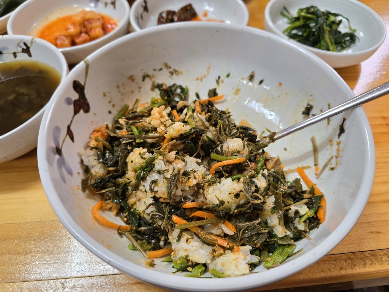 아침을 도동에 있는 산장서 산채 비빔밥을 시작으로