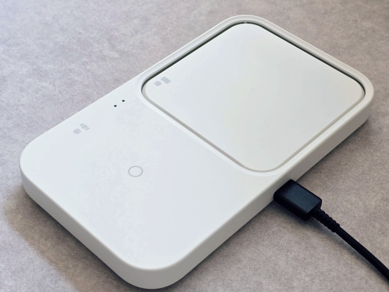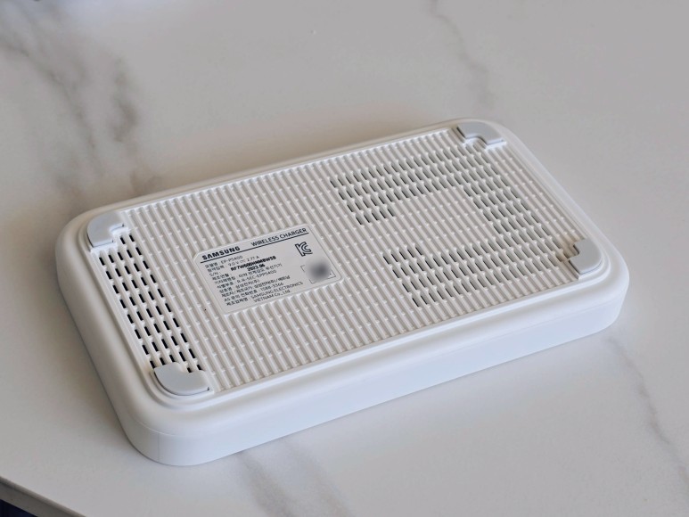 색상이 화이트라선지 깔끔합니다. 오른쪽은 스마트폰과 갤럭시 버즈를 올려서 충전을 하실 수 있습니다. 왼쪽의 경우, 갤럭시 워치 전용 충전부가 있습니다. 워치 충전부는 자석으로 붙는 방식으로 워치 충전독과 유사하다고 보심 됩니다.