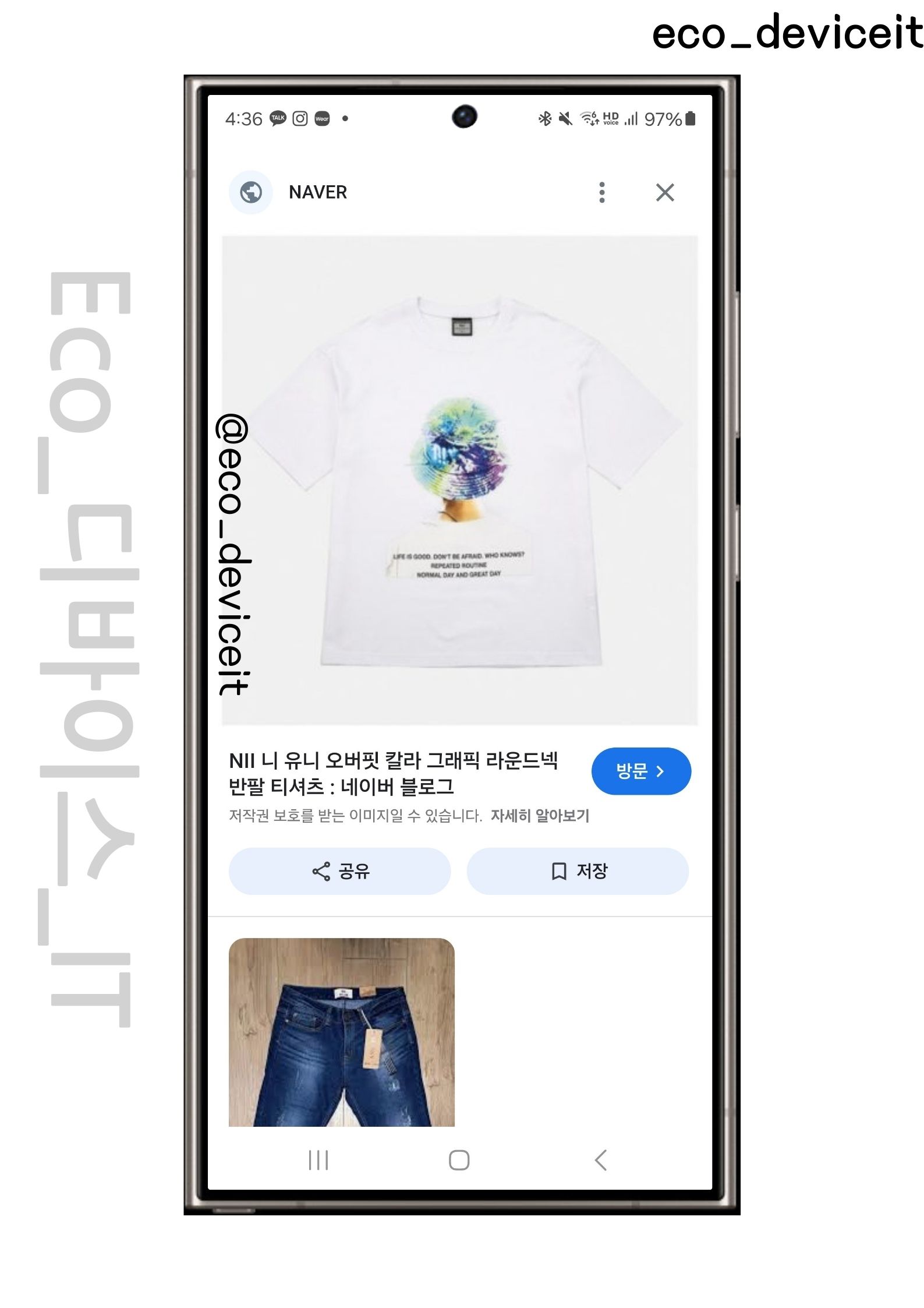 서클투서치로 티셔츠 정보를 찾았습니다. 이번 여름휴가엔 위 티셔츠와 청바지로 캐주얼한 룩으로 정했습니다.