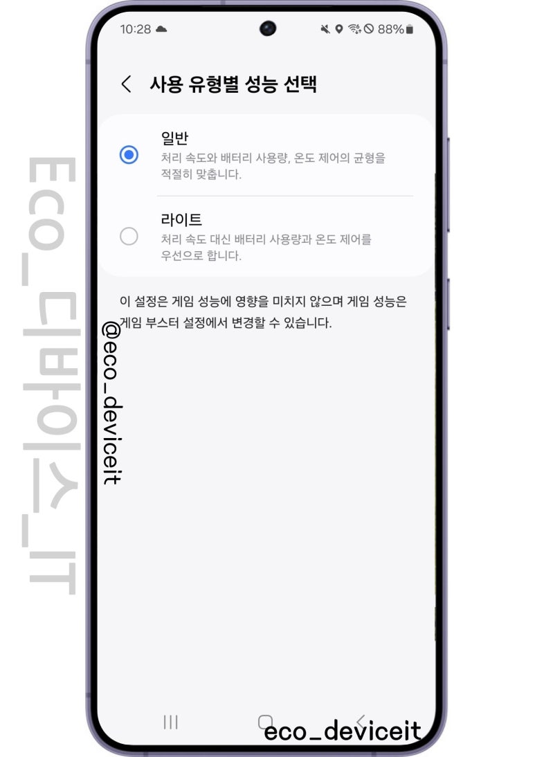 배터리가 정말 빠르게 닳는다면 설정에서 사용 유형별 성능 선택에 라이트 모드를 활성화한다면 좀 더 배터리를 효율적으로 관리할 수 있습니다.