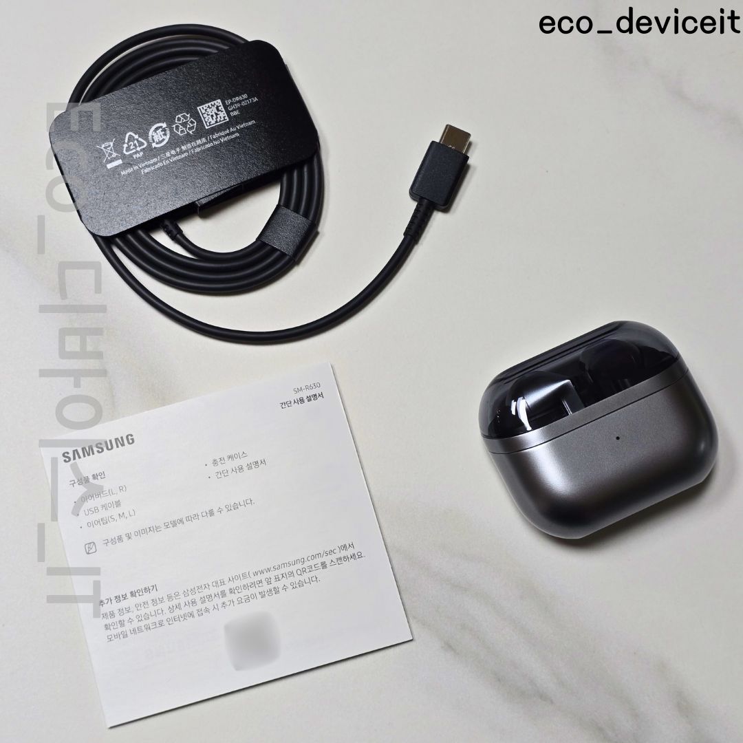 구성품은 갤럭시 버즈3 프로 본체, 25W용 C to C 케이블과 간단 사용설명서 그리고 좌우 이어팁 3세트(S,M(기본 장착),L) 정도 들어있습니다.