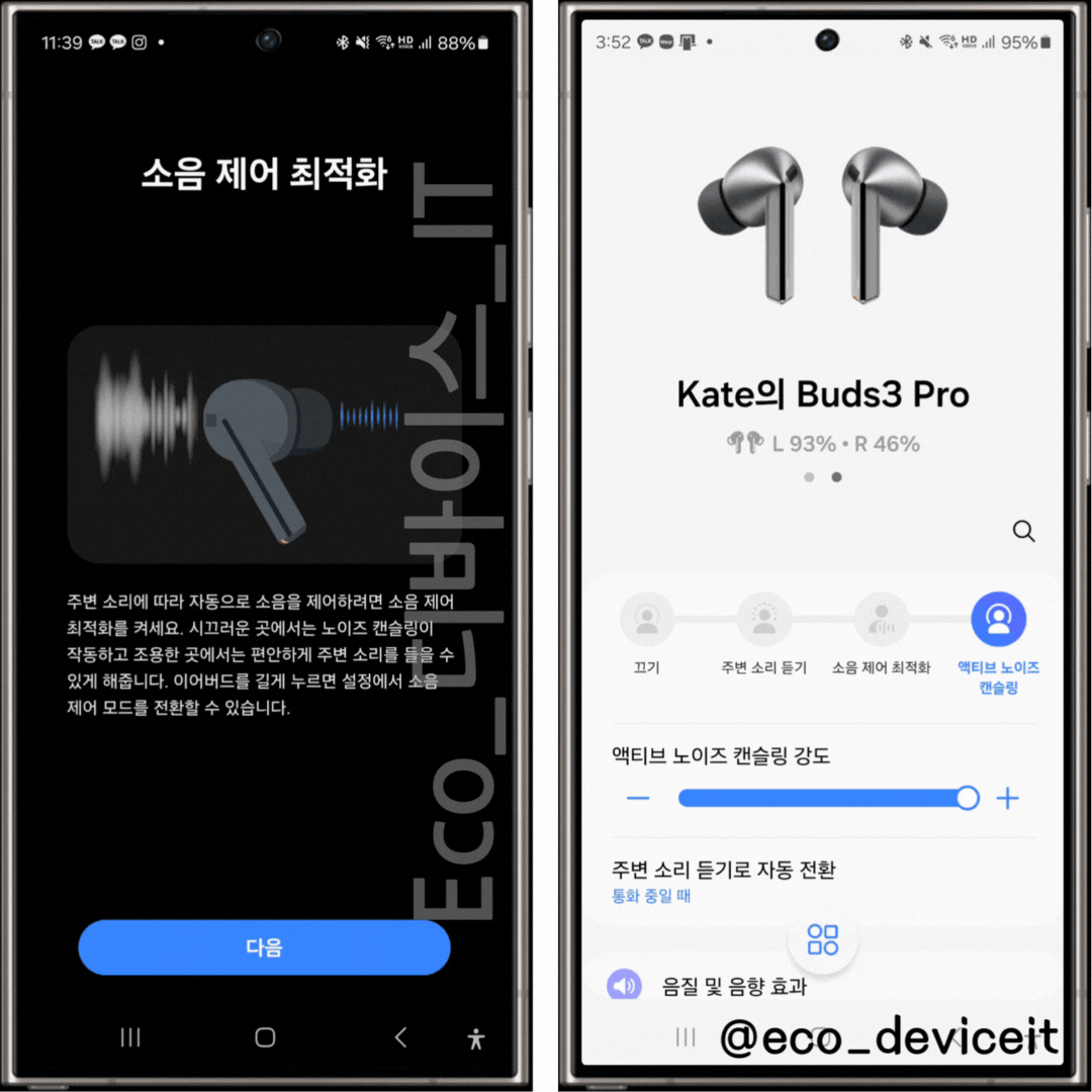 이번에 소음 제어 최적화라는 기능이 들어갔습니다. 주변 환경이 시끄러운 환경에서는 액티브 노이즈 캔슬링, 조용한 곳에서는 조용히 주변 소리를 들을 수 있게 최적화한다고 합니다.
