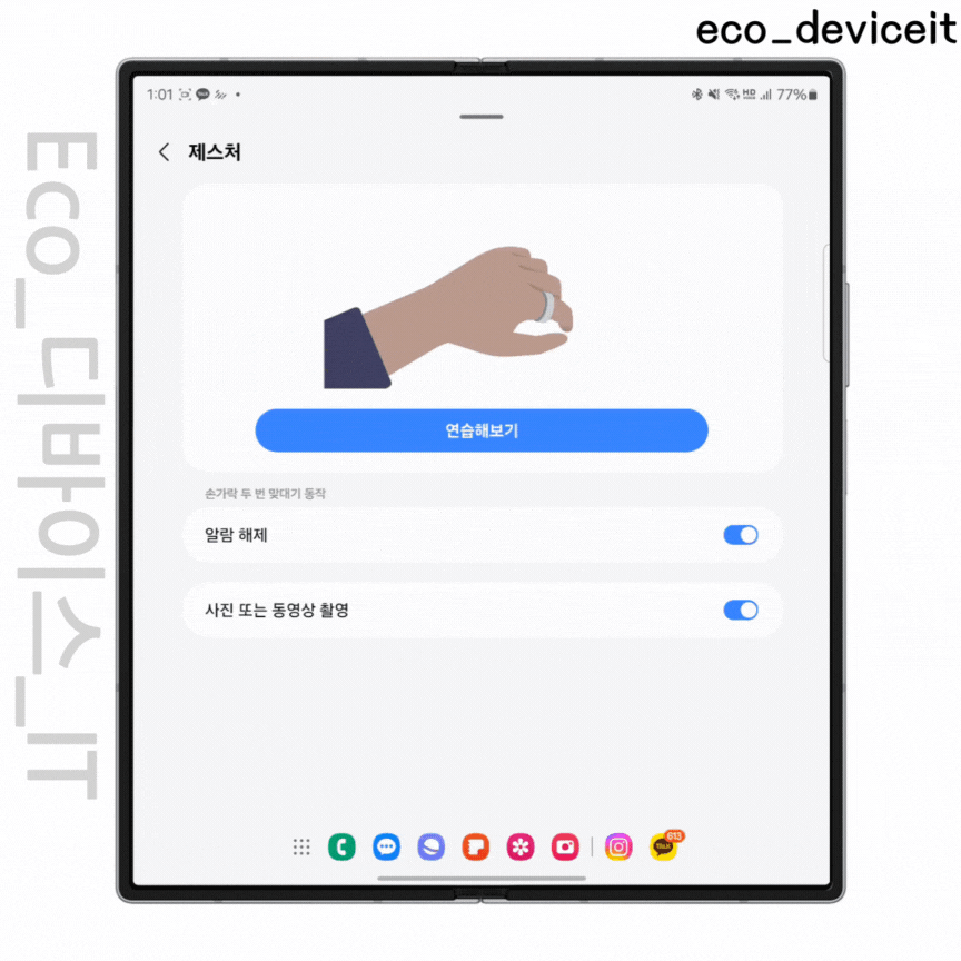 갤럭시 링의 경우 자이로센서가 들어가 손가락으로 제스처를 취해서 알람을 해제할 수 있고, 카메라에서 셔터 기능도 활용하실 수 있습니다. 여행갈 때 꿀기능이겠네요! 인식 잘 되서 놀랬습니다. 해당 제스처 기능은 One UI 6.1.1 이후 기기에서 사용하실 수 있습니다.