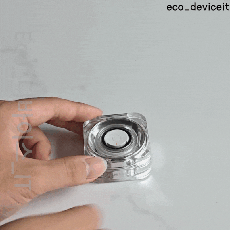 갤럭시 링의 충전 케이스는 굉장히 투명하게 반지 케이스처렁 되어있습니다. 처음 딱 봤을 때 갤럭시 버즈 삼다수 케이스가 생각날 정도였습니다. ㅋㅋㅋㅋ 케이스는 투명하면서 세련되게 디자인되어 있네요. 중앙에는 페어링 버튼이 있네요.