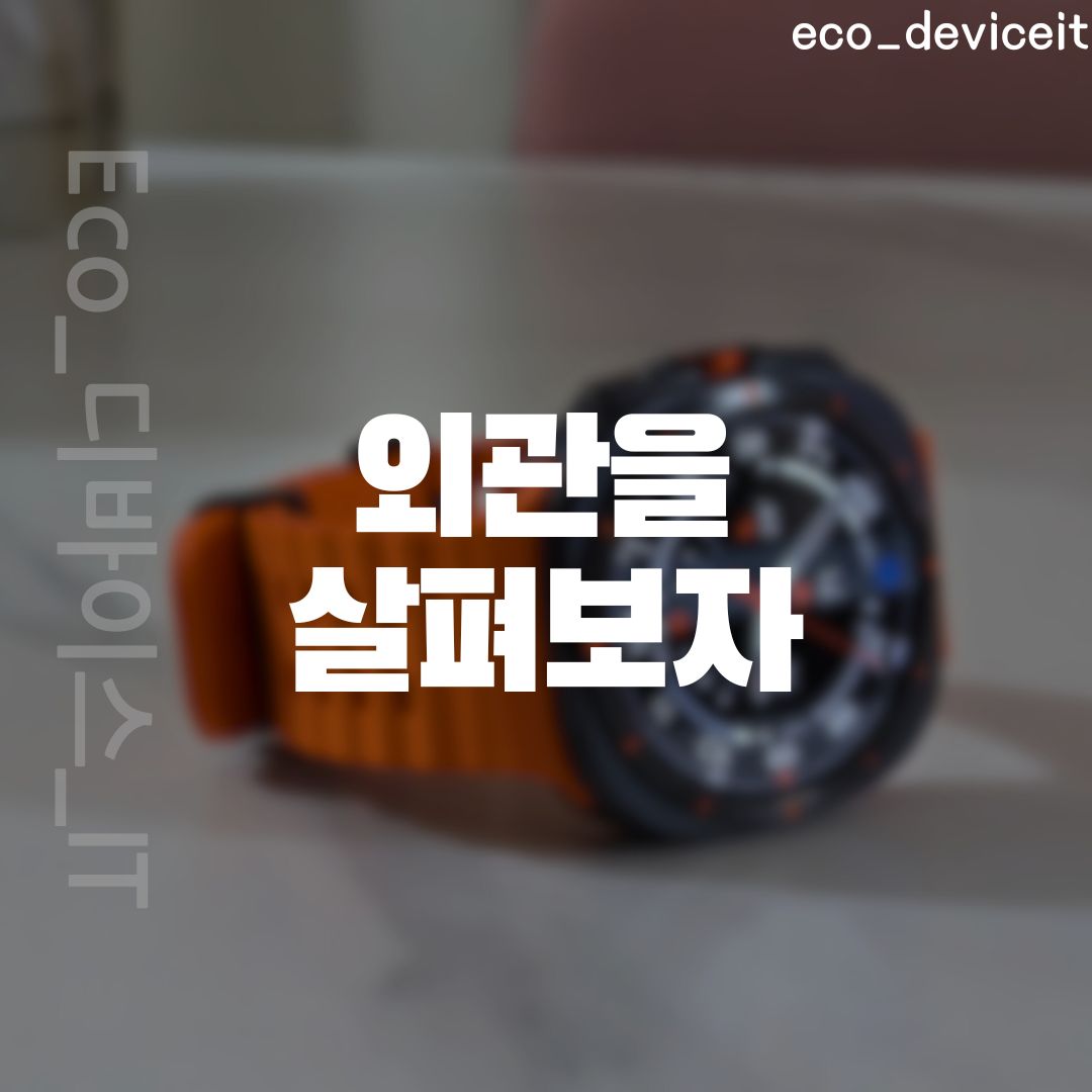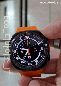 저는 그레이 색상을 구입했는데 너무 튀지 않을까 싶었는데 나름 시계에도 오렌지 색상으로 포인트를 주어 스포티한 러기드함을 더했더라고요. 외관은 둥근 사각형 형태의 원형 디자인을 채택했습니다. 워치 울트라는 삼성 갤럭시 워치의 아이덴티티이자 자존심이었던 베젤링이 사라지고 가상 터치형 베젤링으로 컨트롤 할 수 있습니다.