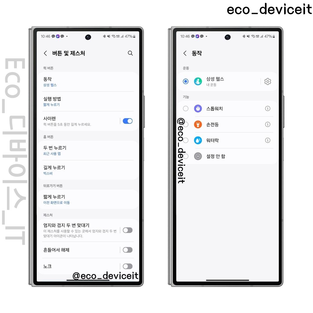 워치 울트라 하면 동작 버튼에 대하여 많이 궁금하실거 같아요. 동작 버튼의 경우 삼성 헬스의 운동 바로가기, 스톱워치, 손전등, 워터락 등으로 활용할 수 있습니다. 이걸 나중에 잘 하면 스마트싱스 스마트 버튼으로 컨트롤 할 수 있는 기능으로도 대체할 수 있는 기능으로 사용할 수 있지 않을까요?!