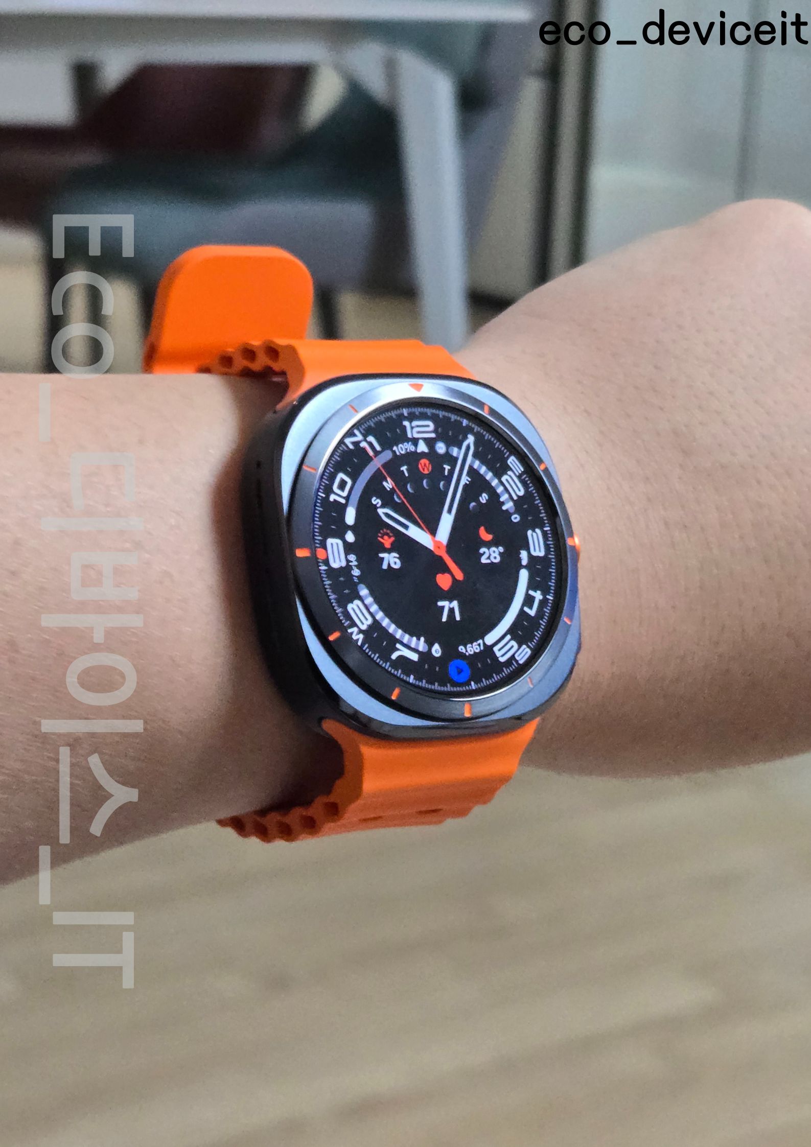 착용했을 때의 모습은 이런 모습입니다. 워치에선 가장 중요한게 밀착감이라고 생각합니다. 밀착감이 떨어지면 센서가 아무리 좋더라도 센서의 정확도가 떨어지기 때문에 이번 워치 울트라 착용감 하나는 정말 좋습니다.