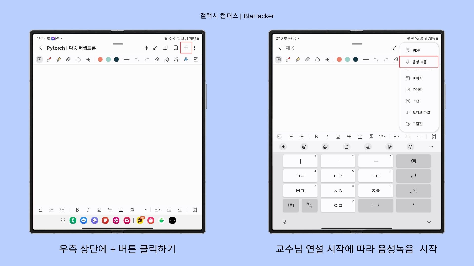 삼성노트 우측 상단에 + 버튼을 클릭하면 다양한 삼성노트의 편리한 기능들이 나타나게 됩니다. 수업 시작에 맞춰 음성 녹음을 진행하시면 됩니다.