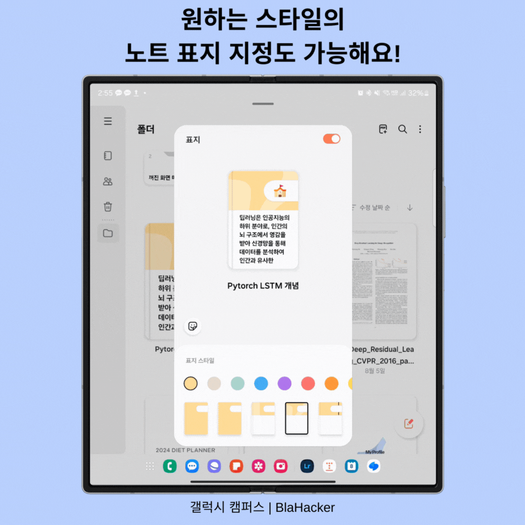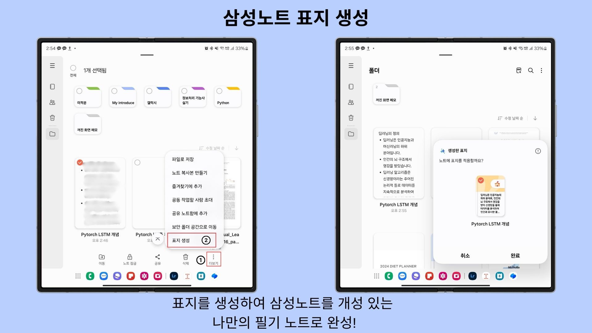 삼성 노트에서 지금까지 작성해둔 노트의 표지도 개성 있게 꾸미실 수 있습니다. 표지 생성을 원하는 노트를 길게 눌러 더보기 버튼을 클릭하여 갤럭시AI가 내용을 통한 최적화된 표지를 정해줘요!