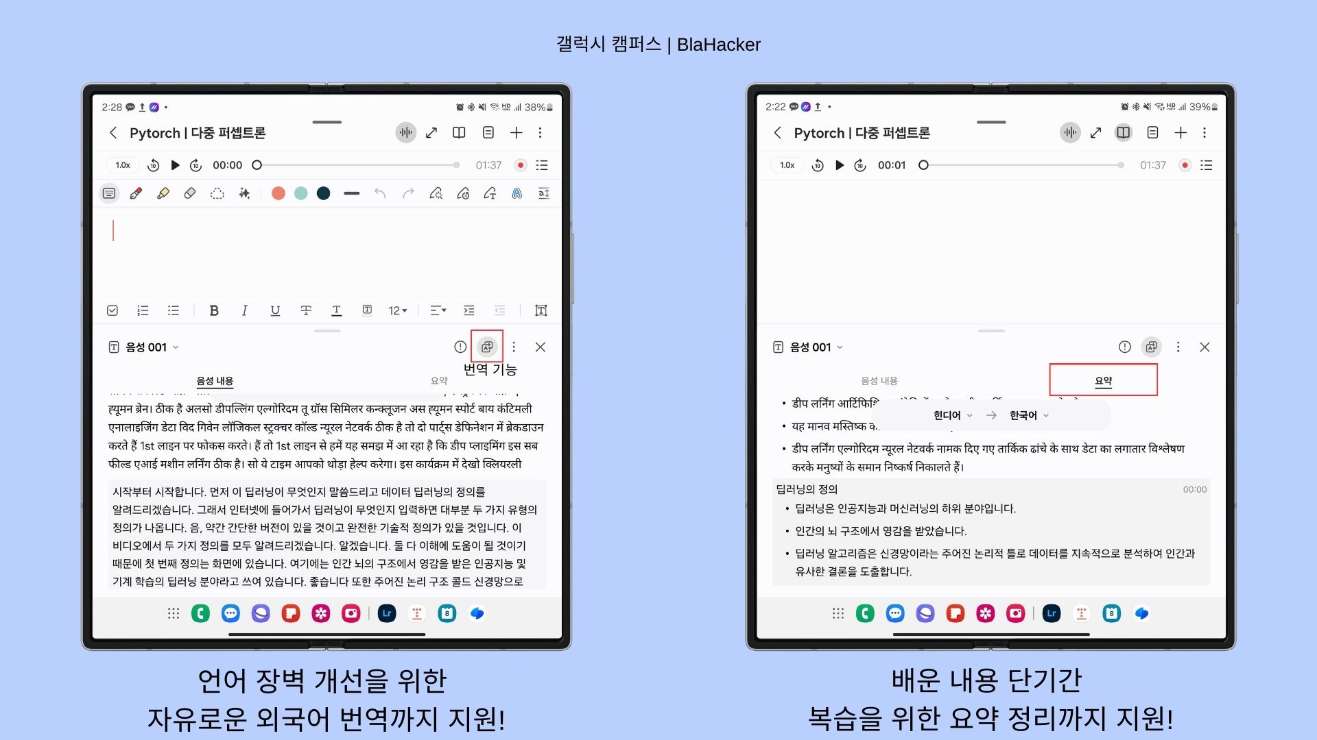 외국어로 수업하시는 교수님들도 계시기 때문에 언어 장벽 개선을 위하여 번역 기능도 지원하고 있습니다. 그리고 배운 내용을 정리하고 싶을 때 요약 기능이 정말 실용적으로 갤럭시AI가 분석하여 요약 노트로 만들어줘요!