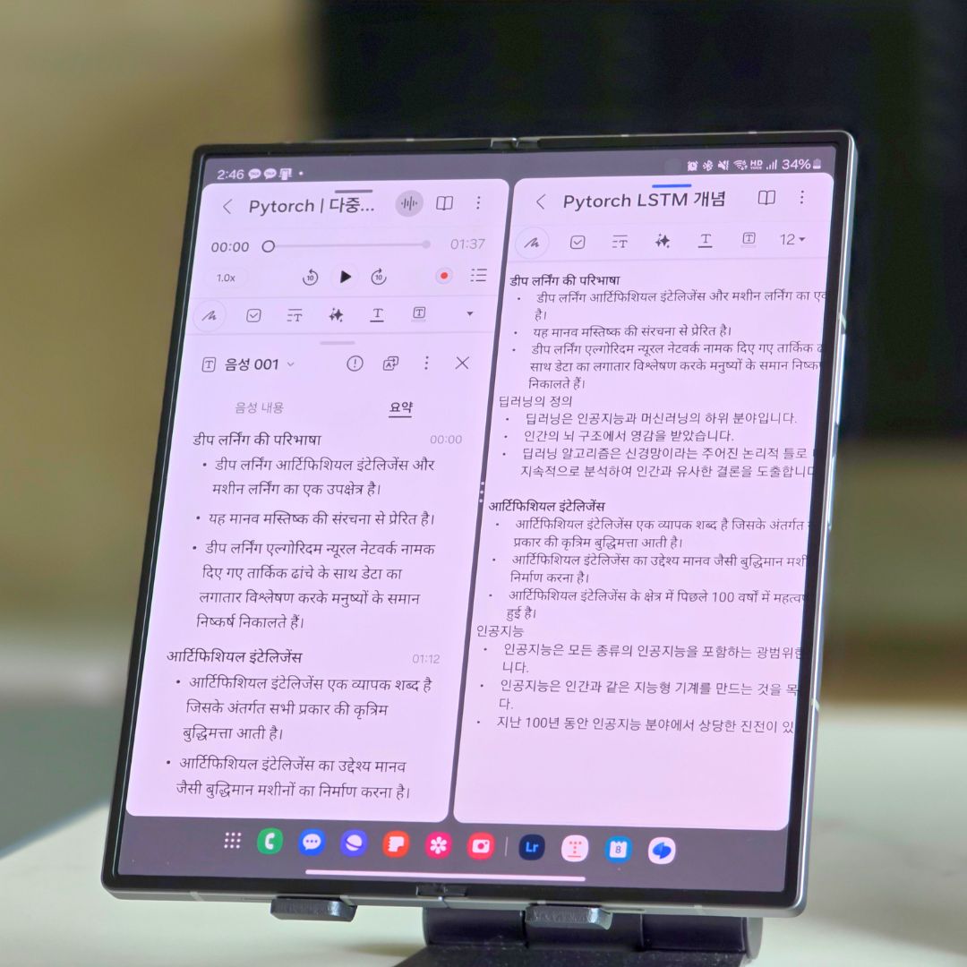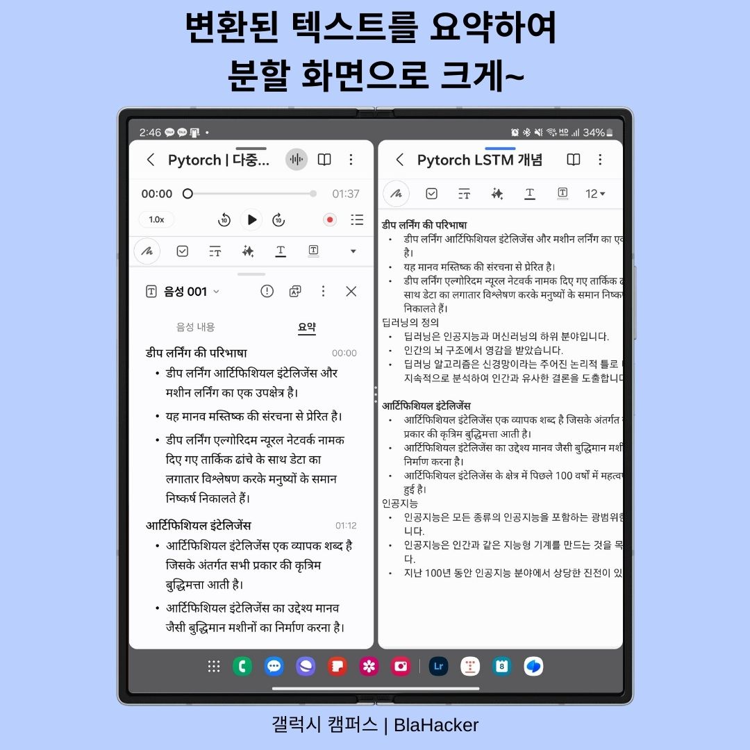 갤럭시 Z 폴드6는 대화면의 멀티태스킹에 최적화된 인터페이스 경험을 제공합니다. 그래서 변환된 텍스트를 요약하여 분할 화면으로도 원문과 비교하며 볼 수 있다는 장점을 가지고 있습니다.
