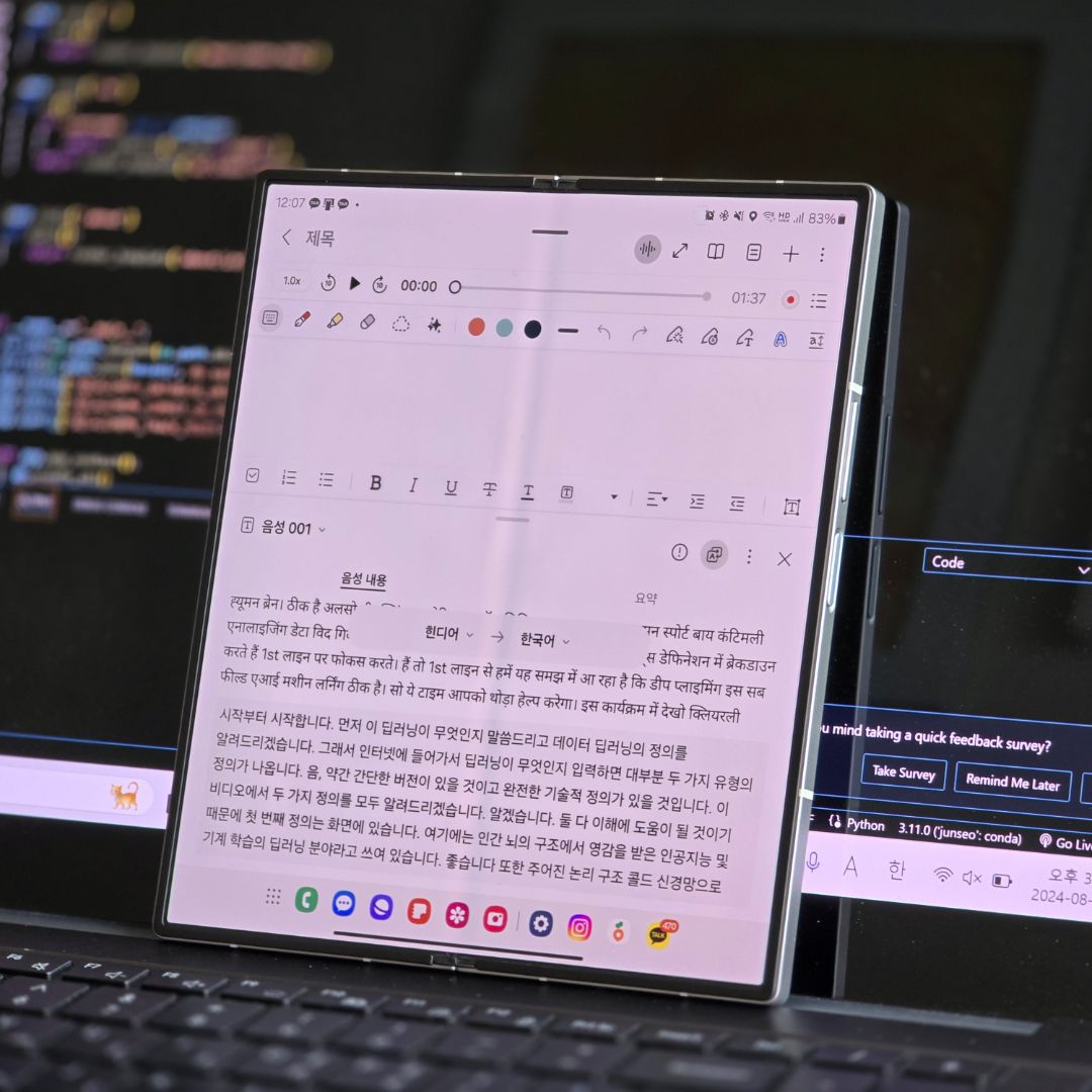 언어 구분 성능도 좋은 편이어서 저는 해외 인공지능 강의를 들으며 메모하며 공부를 하는 편인데 이번 삼성노트가 업그레이드되어 성능 개선이 있었습니다. 음성을 통하여 자동으로 언어까지 갤럭시AI가 인지하는게 정말 신기하더라고요!