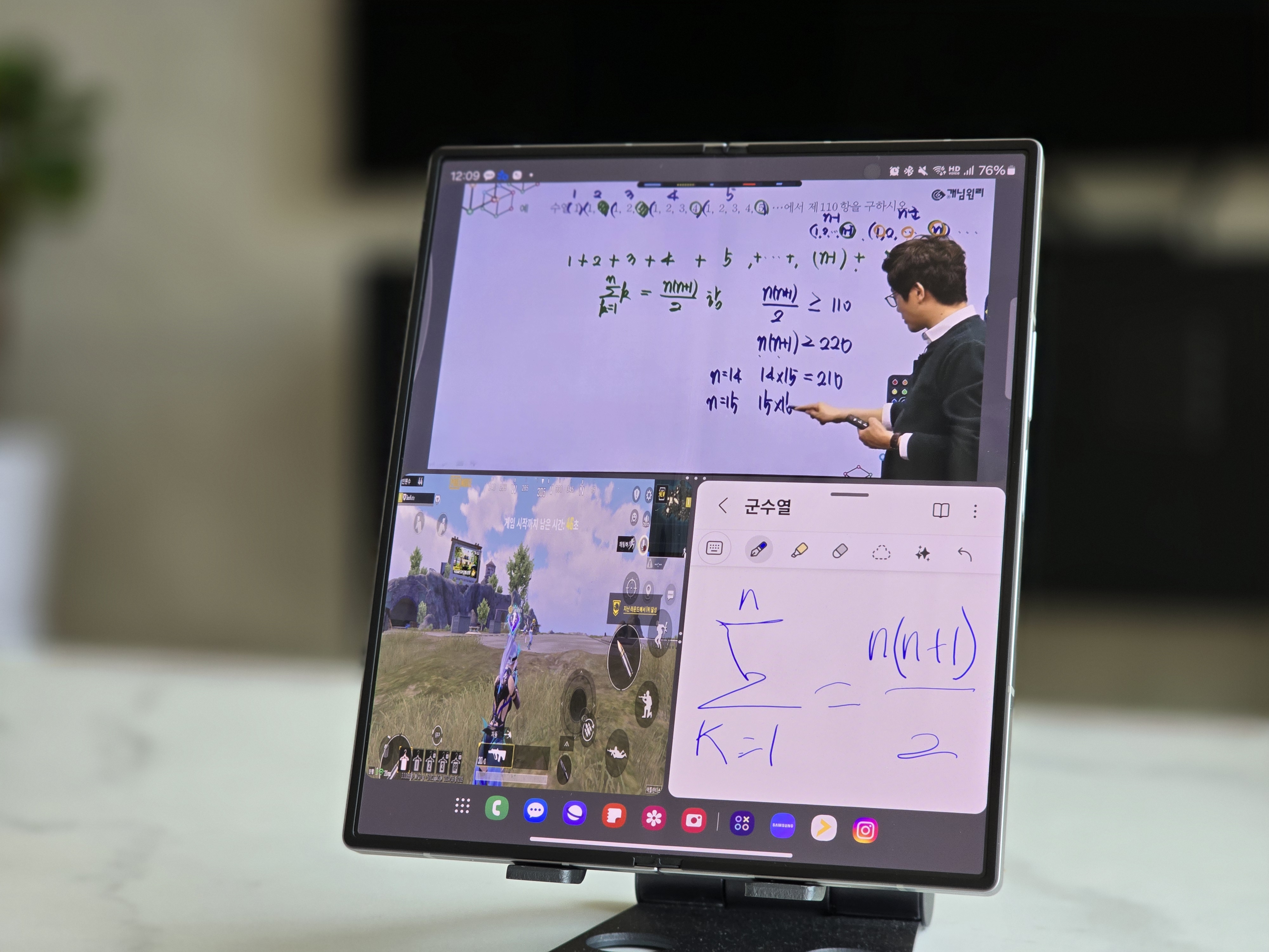특히 단기간에 공부를 끝내야 할 때 아주 잘 활용하고 있어요! 가로로 돌려서 상단에는 수학 강의를 시청하며 하단에는 삼성노트로 필기를 하거나 수학 계산식으로 활용하고 있습니다.