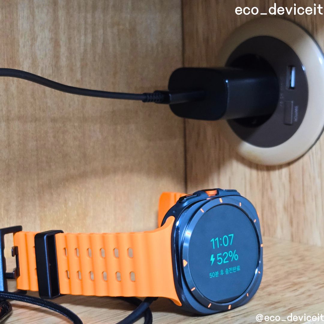 갤럭시 워치 울트라는 최대 10W의 충전 속도를 지니고 있습니다. 처음에 충전할 땐 '내가 충전기를 잘못 선택한건가?' 싶었는데 워치 울트라에 들어간 C 타입 충전 케이블과 정품 25W 충전 어댑터를 사용하여 2시간 정도면 완충이 됩니다.