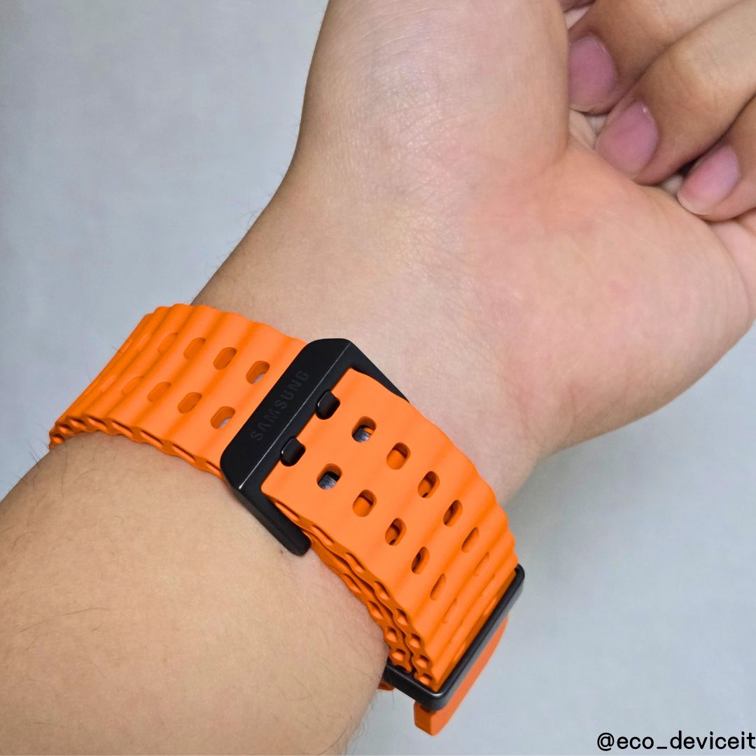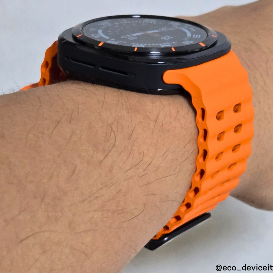 갤럭시 워치 울트라는 그러한 피드백이 있어서였는지 워치 울트라는 기본적으로 마린 밴드를 제공합니다. 마린 밴들를 착용했을 때 크게 다가왔던 점이 밀착력 좋아졌다는게 가장 크게 체감되었습니다. 위 사진을 보다시피 양 사이드에 빈틈이 없어지고 착 감기는듯한 느낌입니다.