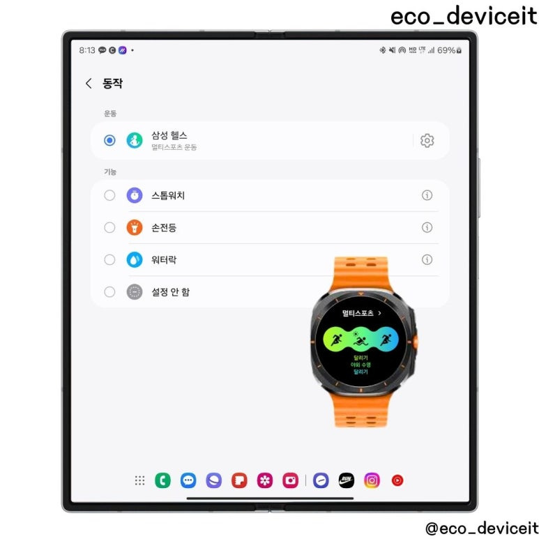 갤럭시 워치 울트라는 바로가기를 위한 동작 버튼이 별도로 추가되었습니다. 동작 버튼을 활용할 수 있는 기능은 삼성헬스 운동 바로가기, 스톱워치, 손전등, 워터락으로 활용하실 수 있어요. 불편하다면 설정 안함으로 사용하실 수도 있습니다.