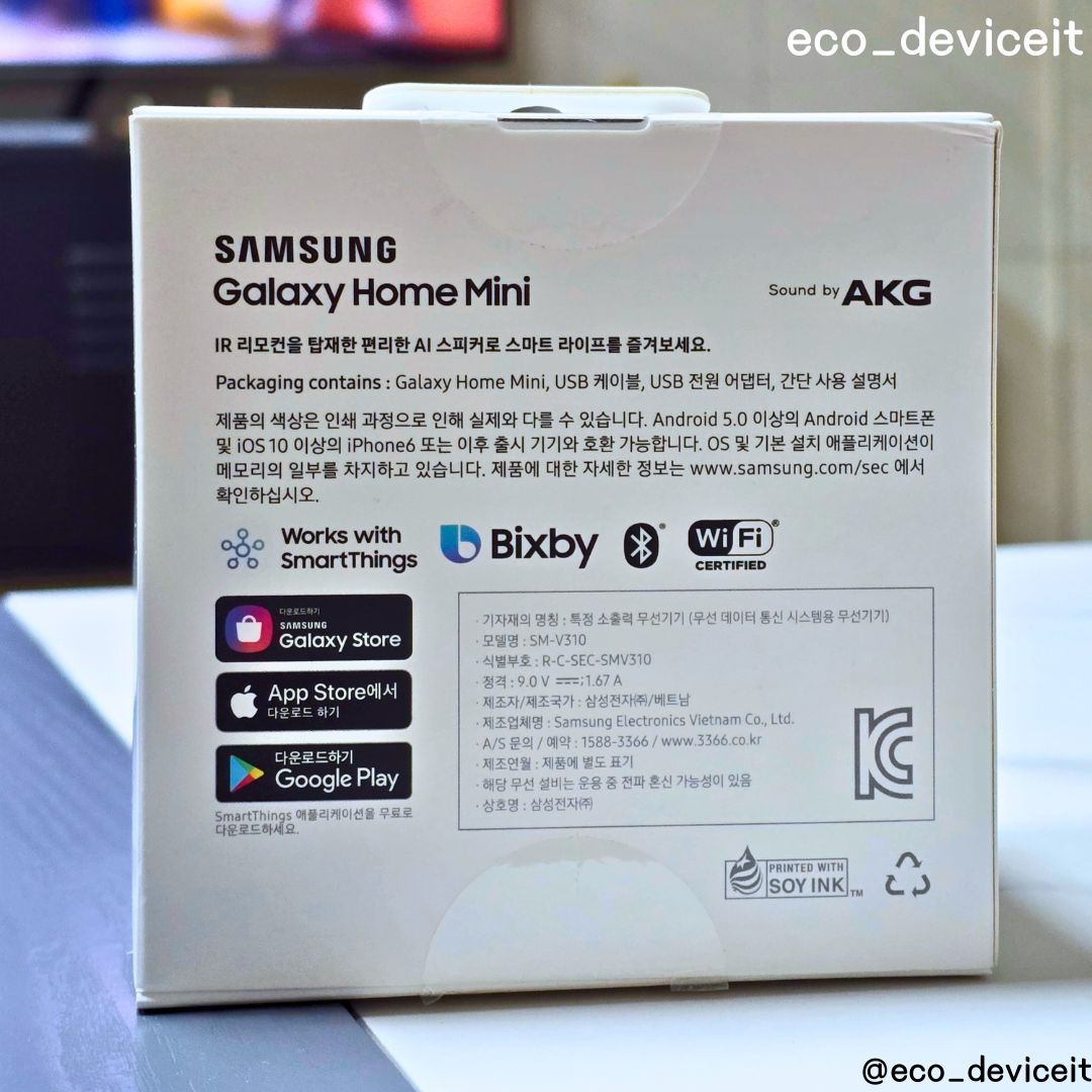 후면엔 안드로이드나 IOS에서 스마트싱스를 활용하여 제어를 할 수 있다고 작성되어 있습니다. 삼성 갤럭시 스마트폰이 아니더라도 안드로이드와 IOS에서 갤럭시 홈 미니를 사용하실 수 있습니다.