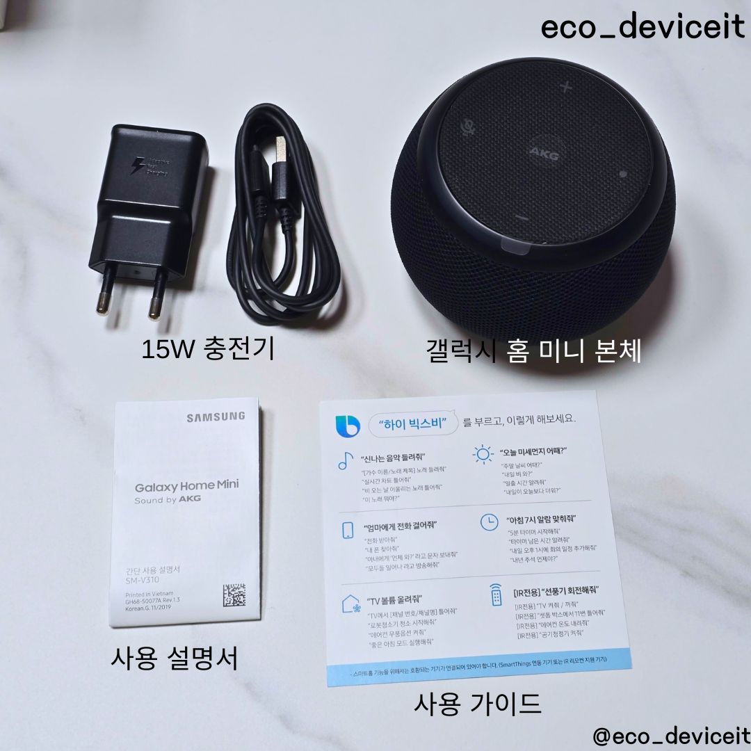 갤럭시 홈 미니의 구성품은 좌측 상단부터 시계 방향으로 15W 고속충전기, 갤럭시 홈 미니 본체, 사용 설명서 그리고 빅스비 사용 가이드 팁이 있습니다.