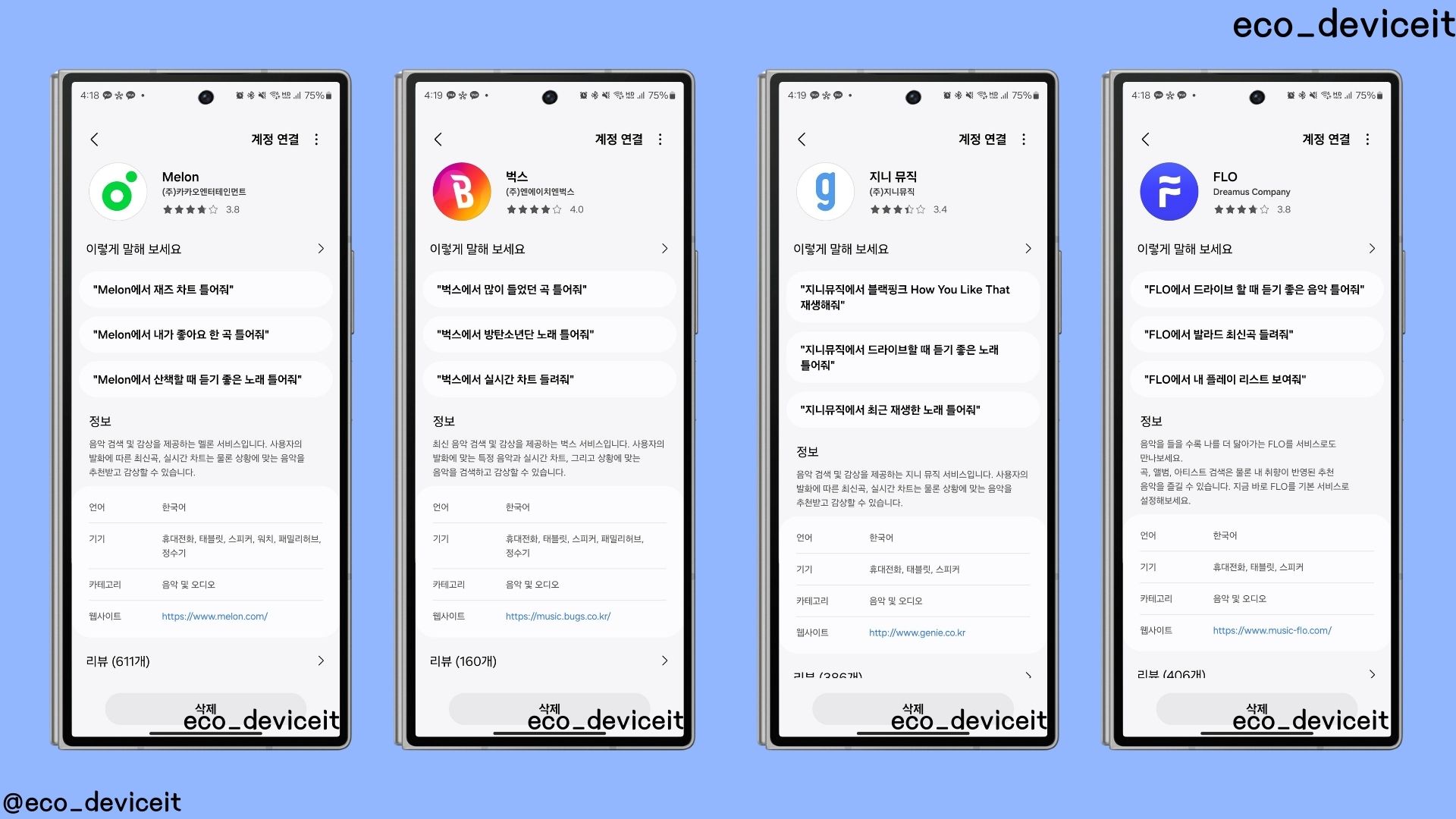 갤럭시 홈 미니에서 지원하는 뮤직 서비스는 Melon, 벅스, 지니뮤직 그리고 FLO로 4가지로 재생할 수 있습니다. 갤럭시 스마트폰은 기본적으로 유튜브 뮤직이 설치되어 있는데.. YT Music이 없는건 아쉽네요..