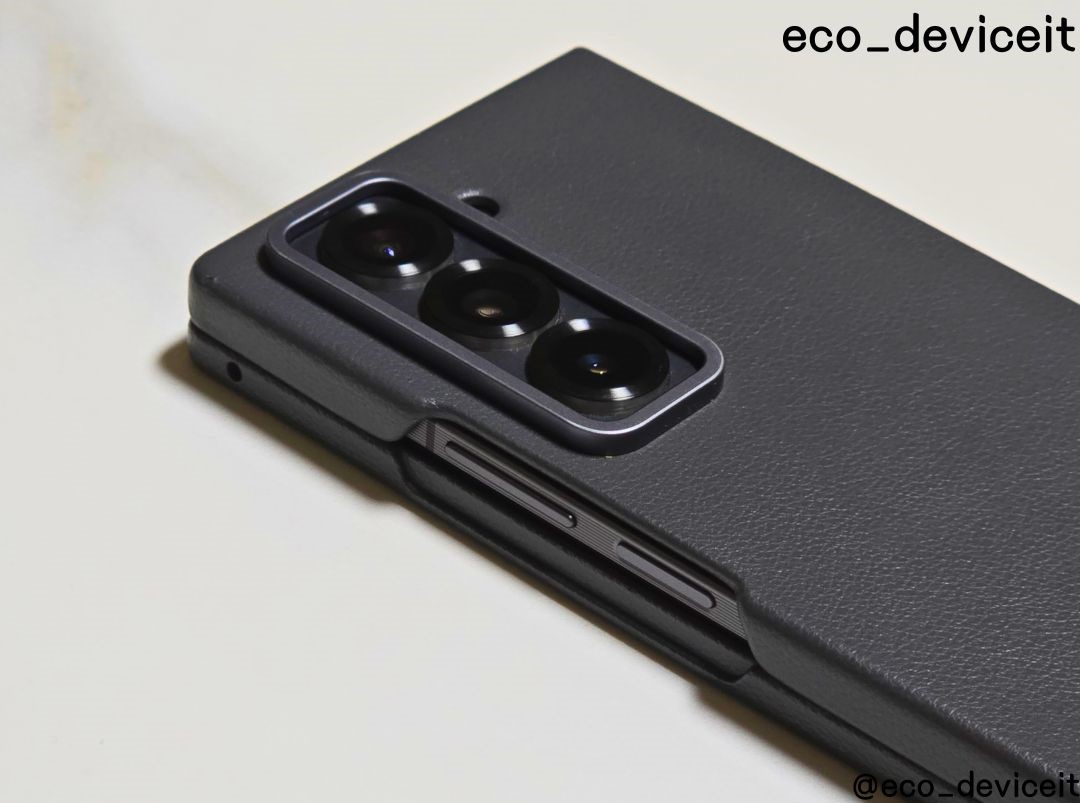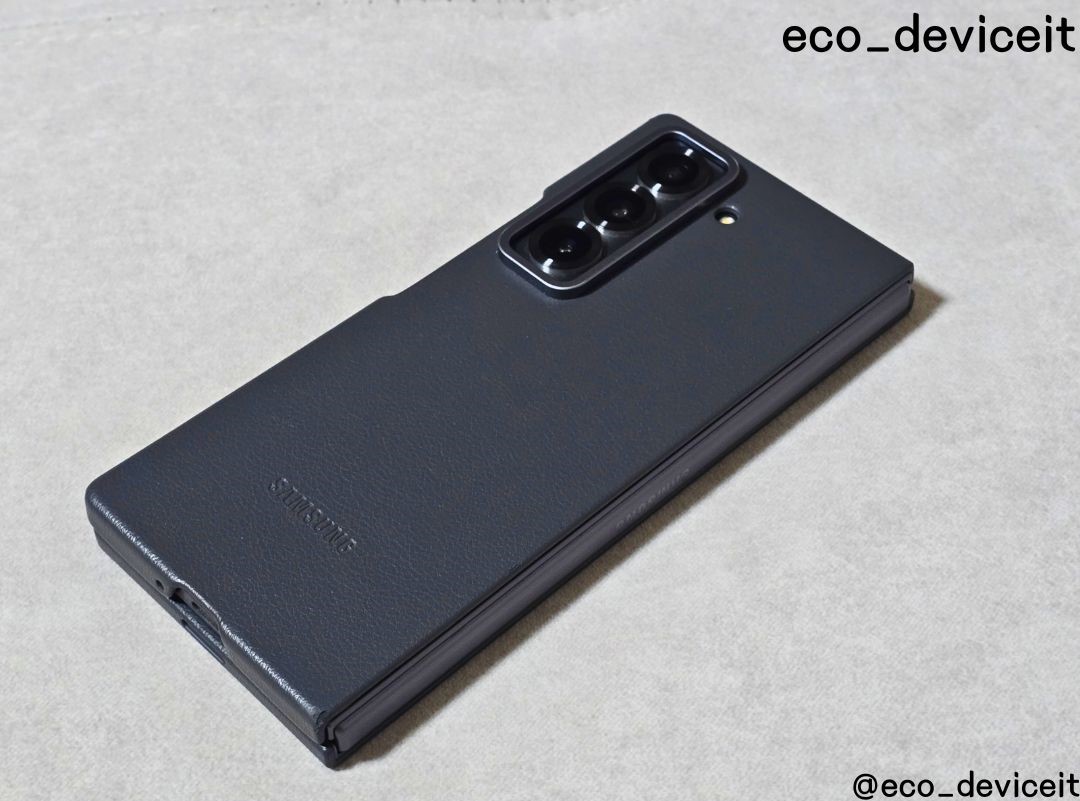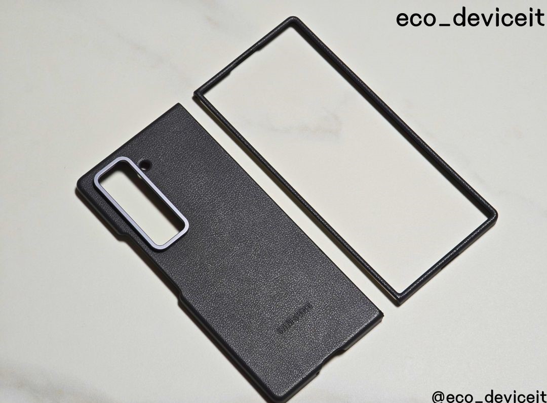 갤럭시 Z 폴드SE의 레더케이스는 가죽형태의 케이스와 한 쪽은 가죽 표면을 표현한 플라스틱으로 만들어졌습니다.