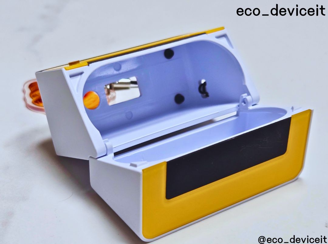 케이스를 닫았을 때의 느낌입니다. 전반적으로 화이트 색상의 바디와 옐로우와 블랙의 조화가 좋습니다. 크로와상 키링 색감과도 아주 잘 어울리네요.