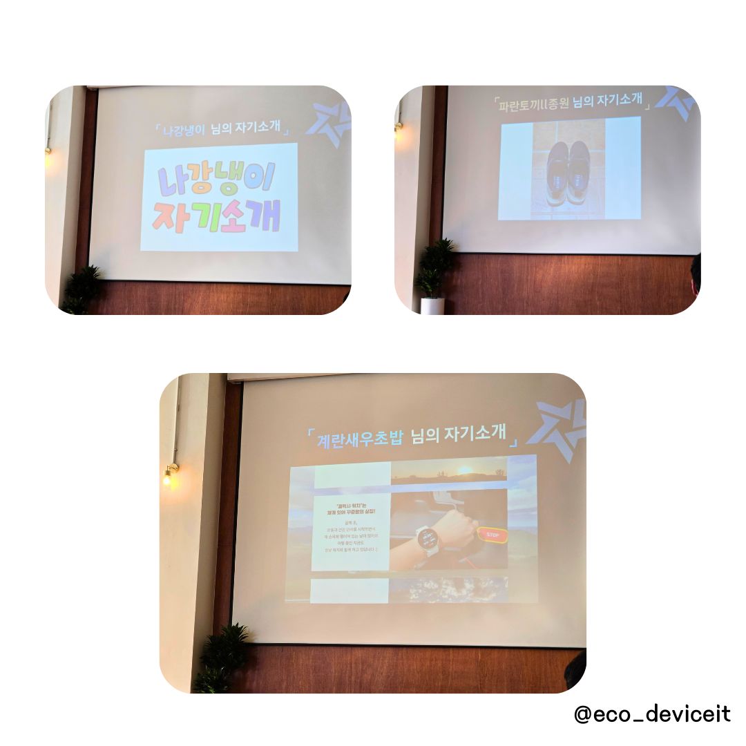 이제 서로를 알아갈 시간, 자신을 소개할 물건과 함께 자기소개를 통하여 1년동안 함께 활동할 분들의 대하여 더 많이 알아갈 수 있었습니다. 다들 정말 많은 대외활동을 하며 다양한 커리어들을 쌓으신게 정말 많이 돋보였습니다. ㅎㅎ