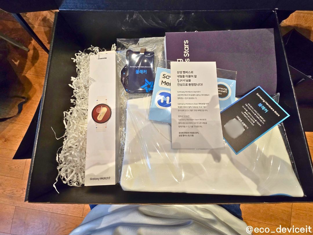 으메~!! 웰컴 키트 안엔 웰컴 레터와 함께 갤럭시 워치 7 40mm 크림 색상,가이드북 네임카드, 커스텀 스티커와 카드, 디지털 푸터 마지막으로 삼성 멤버스 스타즈 커스텀 의류로 구성이 정말 알찼답니다!!