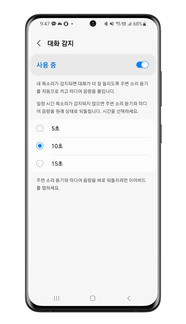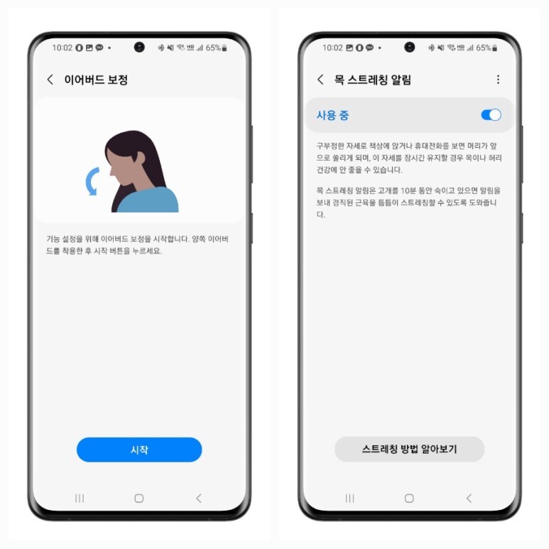 요건 좀 실용적인게 내가 버즈를 착용하고 스마트기기를 볼때 거의 우리 자세는 일정하단 말이에요? 그래서 그 일정함을 유지하면 목과 척추에 좋지도 않아서 자이로 센서를 이용해서 착용한 사용자가 목 스트레칭을 했는지 감지를 해서 일정 시간동안 움직이지 않는다면 알림으로 목 스트레칭을 하라는 알림이 오게 됩니다. 스마트 기기를 자주 보시는 분들이라면 요건 보정후 꼭 사용하시길 추천드려요!