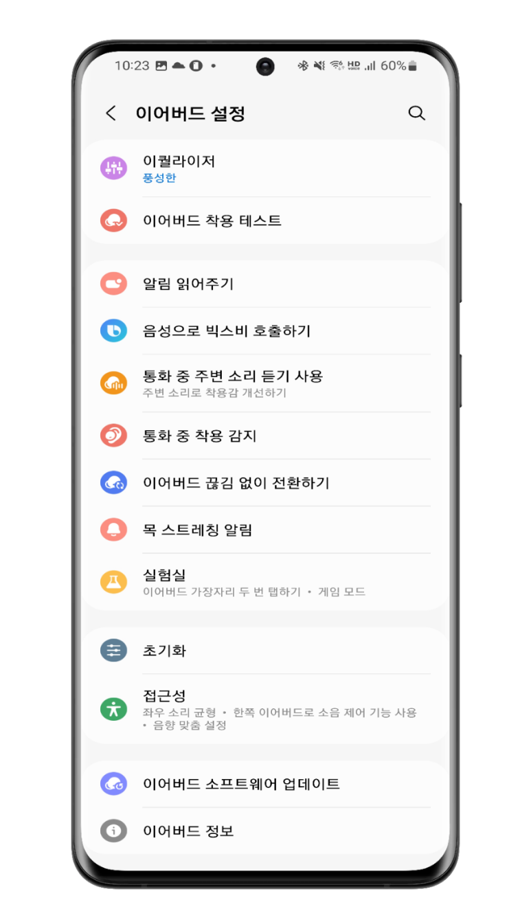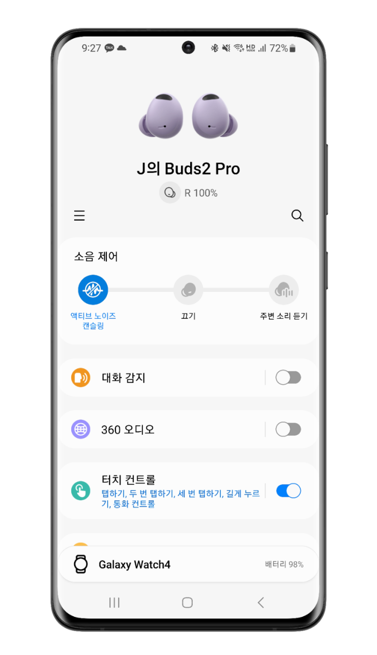 버즈2에만 들어간 착용감지 테스트가 버즈2 프로에도 들어갔습니다. 그래서 내가 이어버드를 잘 착용하고 있는지, 이어팁이 맞는지 이렇게 내 착용 상태를 알 수 있는 기능이 추가되었습니다.