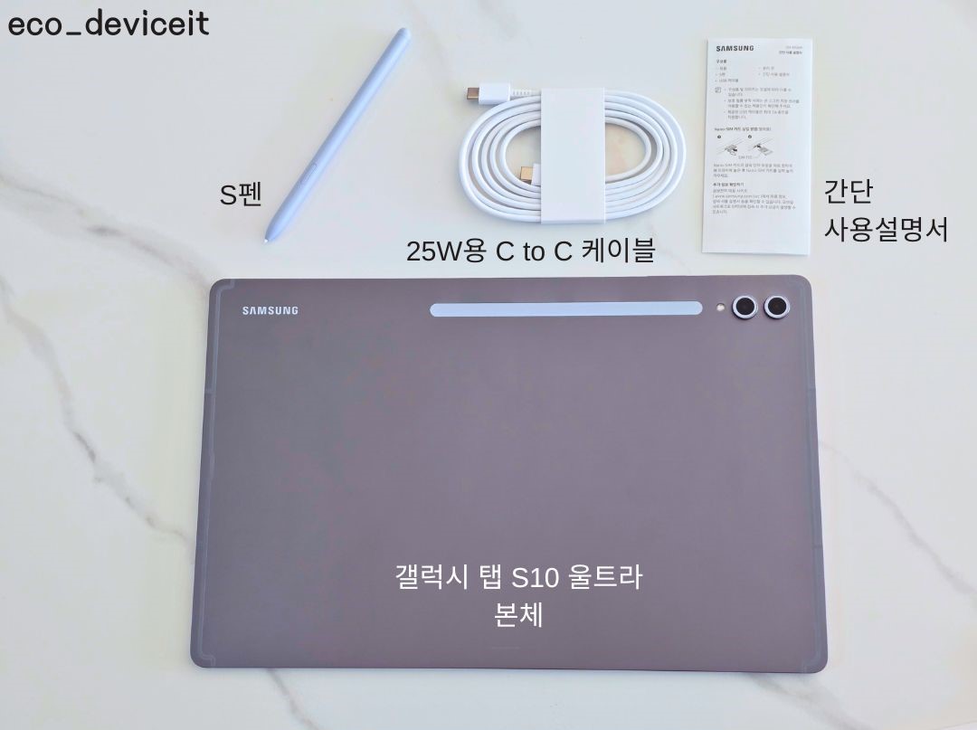 갤럭시 탭 S10 울트라 5G의 구성품은 갤럭시 탭 S10 울트라 본체, S펜, 25W용 C to C 케이블 간단 사용설명서 그리고 유심 핀 정도 들어있습니다.