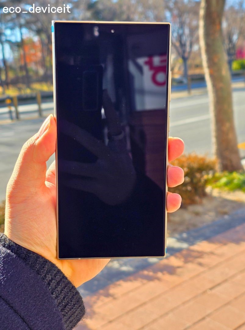 눈치채셨다시피 갤럭시 S25 울트라는 기본적으로 반사방지 화면을 탑재했기에 여기서 필름을 부착하면 반사율이 상대적으로 올라가게됩니다.