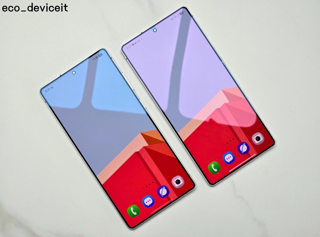 왼쪽이 AR 필름을 부착한 갤럭시 S25 울트라, 오른쪽이 필름을 부착하지 않은 쌩자 디스플레이인 갤럭시 S25 울트라 입니다. 화면이 꺼졌을 때의 차이입니다.