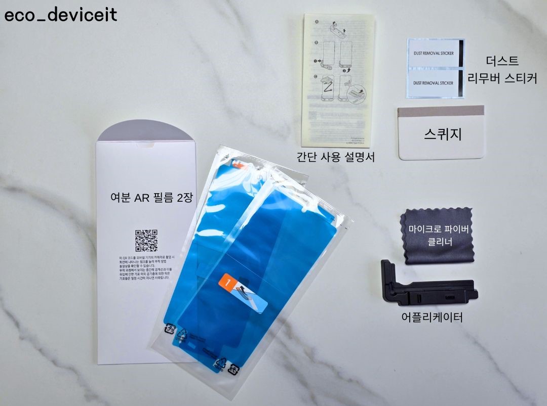 구성품은 여분 AR 필름 2장, 간단 사용 설명서, 먼지 제거 스티커, 스퀴지, 마이크로 파이버 클리너 그리고 어플리케이터 구성입니다. 구성만 봤을 땐, 굉장히 알차네요!!