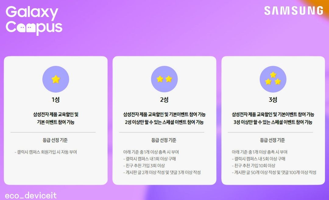 삼성전자 제품 교육 할인 및 기본 이벤트가 참여가 가능하며 3성 이상만 할 수 있는 스페셜 이벤트도 기다리고 있으니 참여하면 좋을것 같습니다.