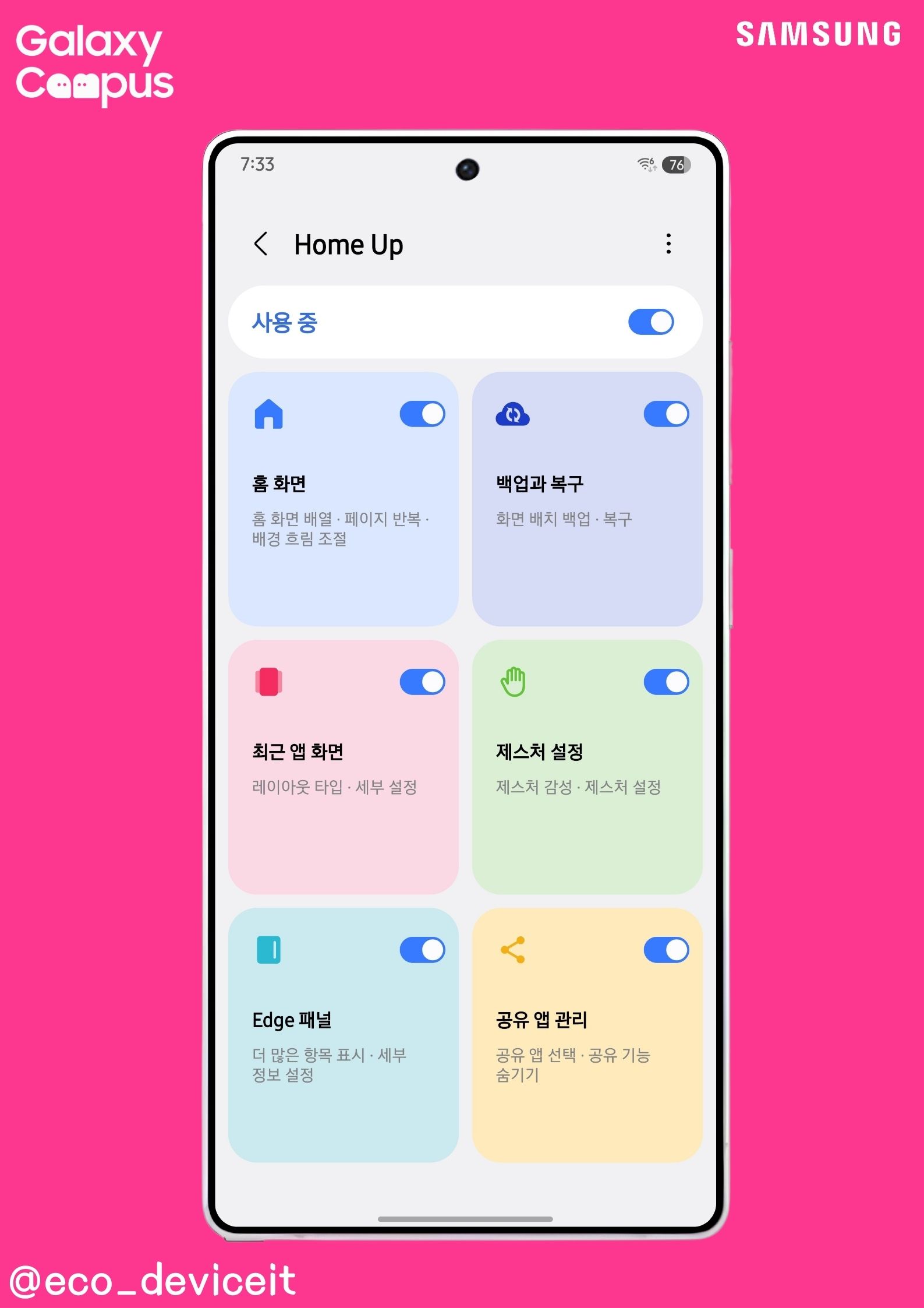 Home Up은 홈 화면, 화면 배치 백업 및 복구, 최근 앱 화면, 제스처 설정, Edge 패널 그리고 공유 앱 관리 기능들을 다양하게 커스텀 할 수 있어요!!