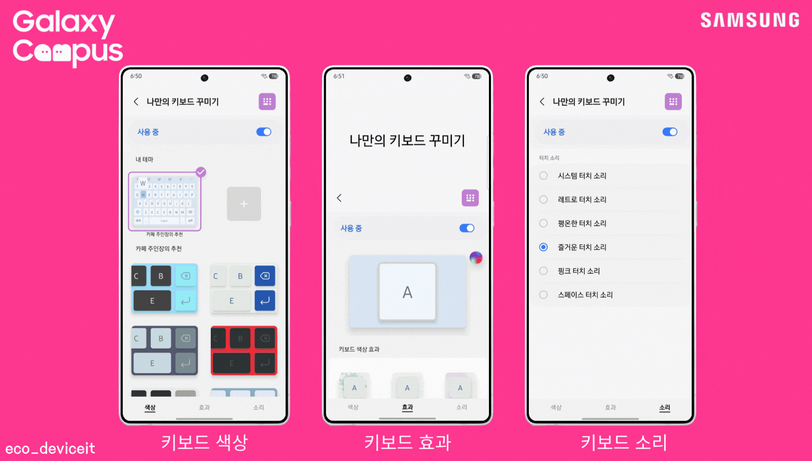 기본적으로 나만의 키보드 꾸미기 탭에서 쉽게 삼성 키보드를 꾸밀 수 있습니다. 키보드 색상부터 키보드 효과 그리고 키보드 소리까지 지정하실 수 있습니다.
