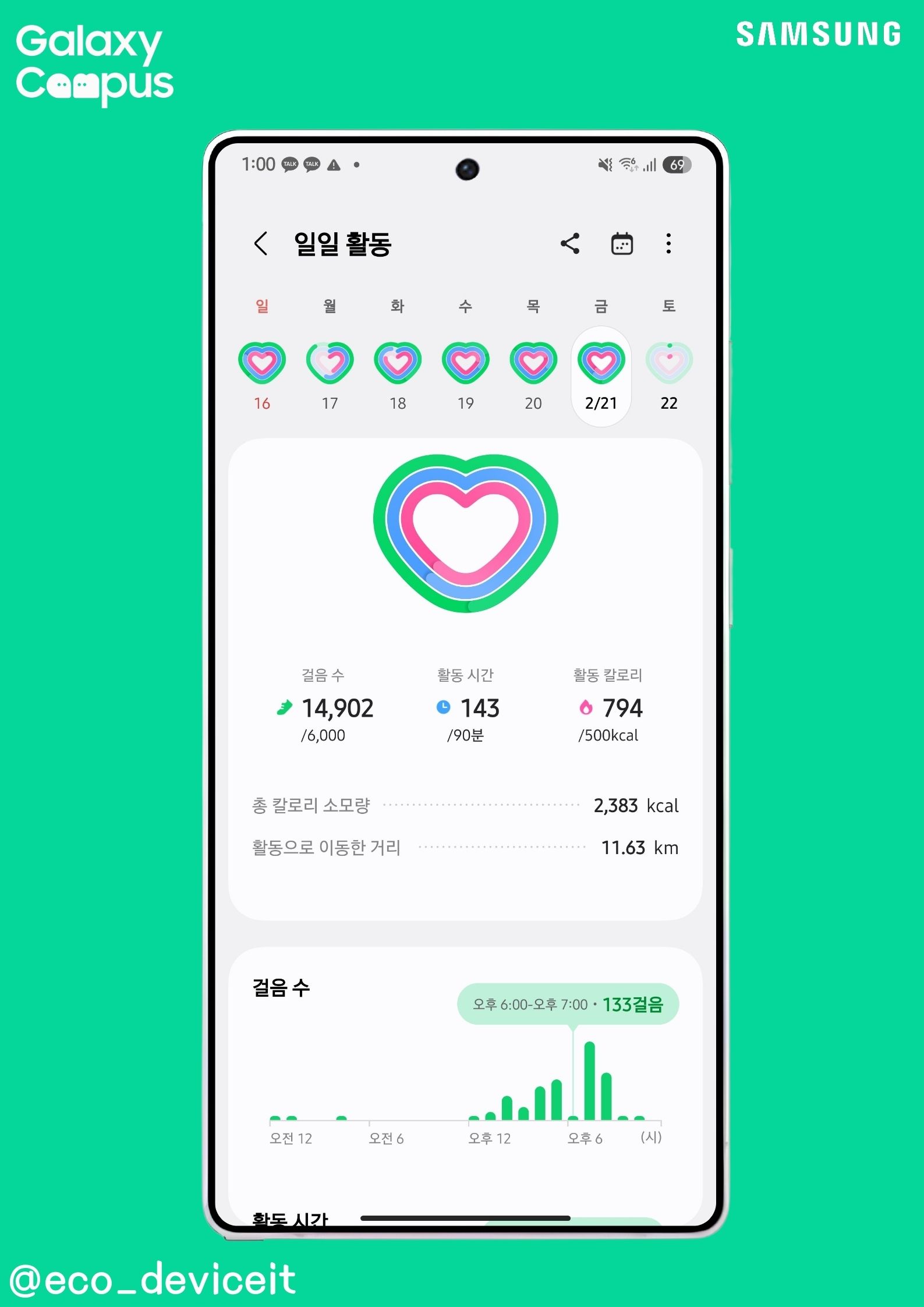 삼성헬스에 탑재된 기능들을 통해 동기부여도 얻을 때도 있고, 갤럭시 워치를 사용하면서 운동하면 맞춤형 코칭까지 제공하다보니 옆에 코치가 있는 것처럼 음성으로 코칭도 해주다보니 점점 더 애용하게 되는거 같습니다.