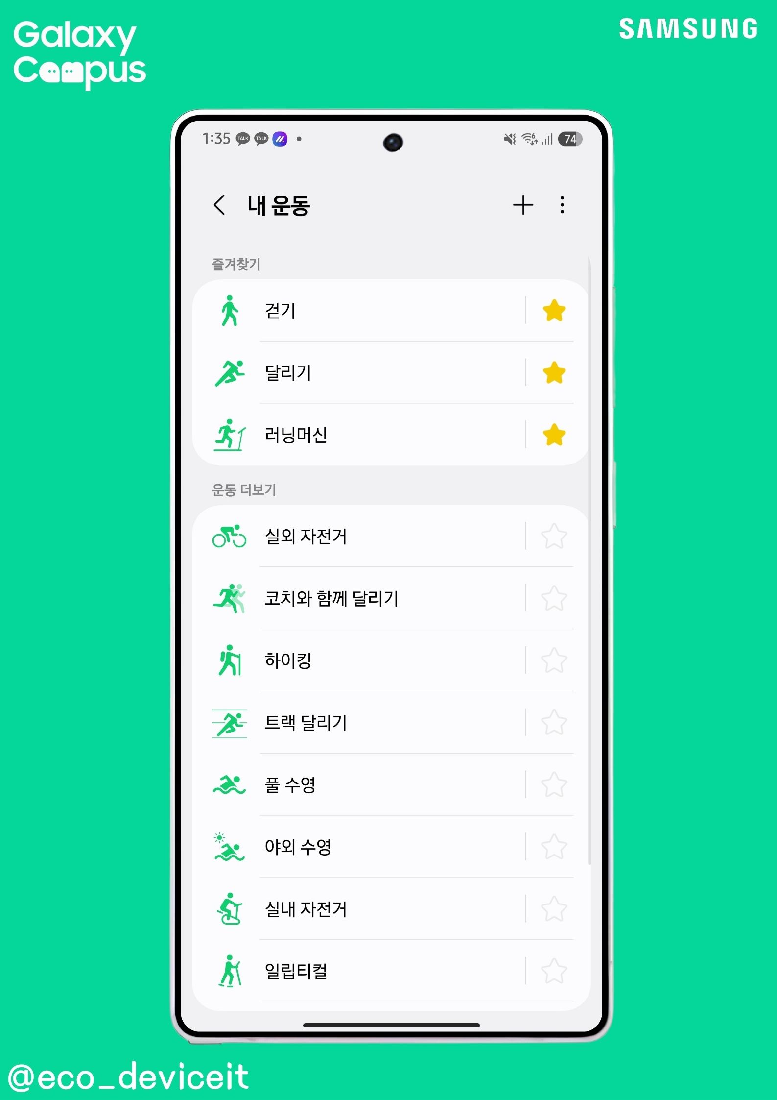 위와 같이 갤럭시 스마트폰 단독으로도 다양한 운동 기능을 활용하실 수 있습니다. 기본적으로 14개의 운동을 지원하며 원하면 새 운동 추가 기능으로 새롭게 운동 및 루틴을 생성하실 수 있습니다.