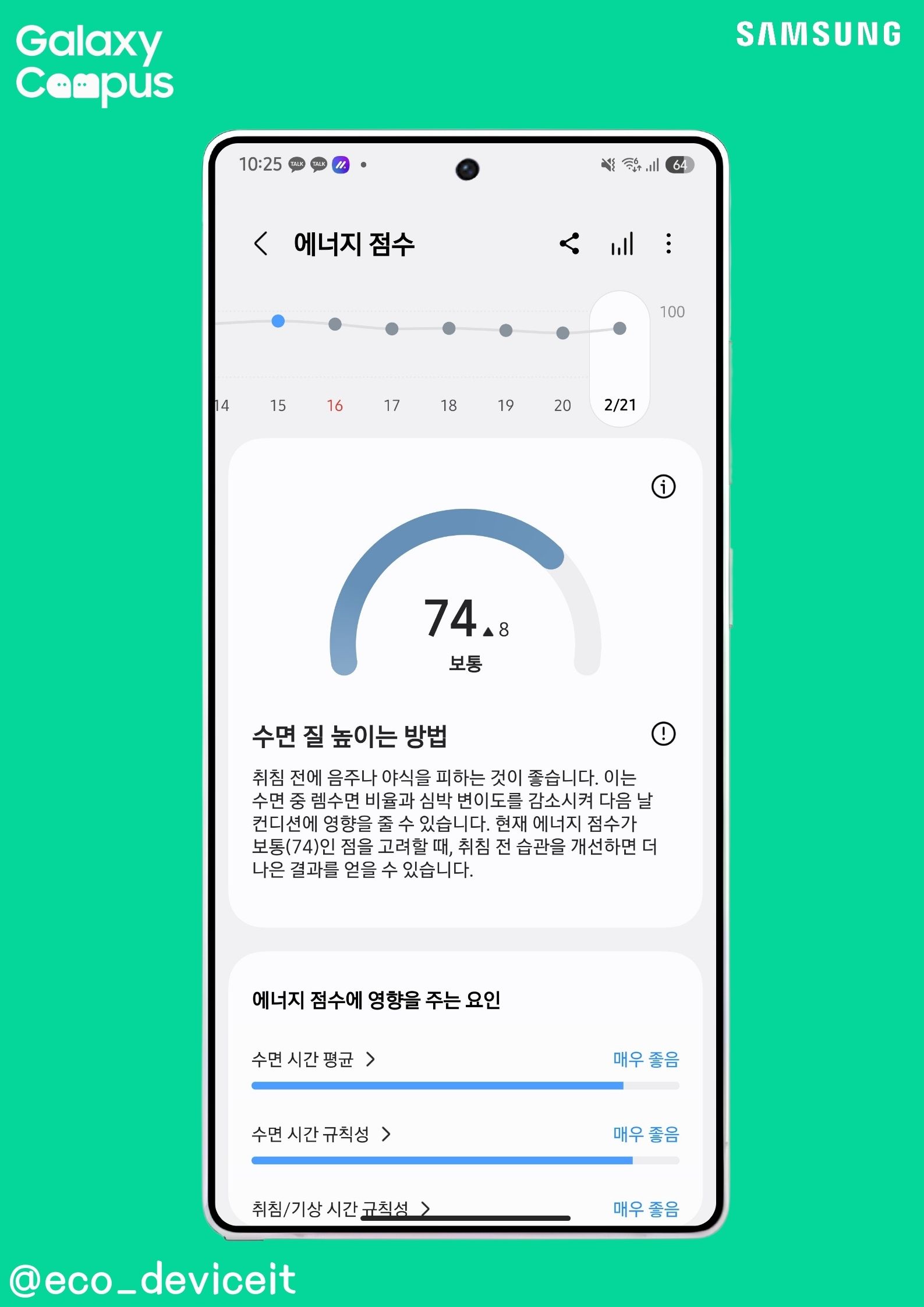 저는 갤럭시 링 그리고 갤럭시 워치 울트라를 활용하여 수면 측정하여 사용자가 일어났을 때 자동으로 결괏값을 수면 점수를 시작하여 수면 단계까지 세부적으로 삼성헬스를 통해 확인할 수 있습니다.