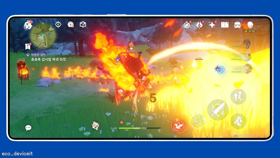 고사양 게임인 원신을 플레이 했을 때, 여전히 안드로이드 환경의 한계인지.. 가까운 오브젝트는 크게 문제가 없는데.. 먼 오브젝트 또는 장소를 바라보았을 때 디테일이 뭉개짐이 있던 것은 갤럭시 원신에서의 아쉬운점이더군요..