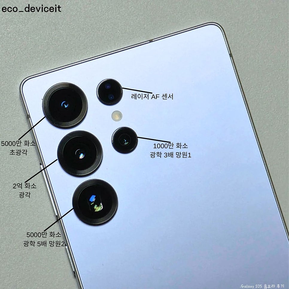 갤럭시 S25 울트라는 좌측 상단부터 시계 방향으로 5000만 화소 초광각, 레이저 AF 센서, 1000만 화소 광학 3배 망원1, 5000만 화소 광학 5배 그리고 2억 화소의 광각 카메라 조합입니다.