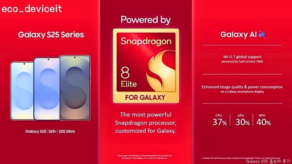 전작인 갤럭시 S24 울트라의 갤럭시용 스냅드래곤 8 3세대와 비교하여 CPU는 37%, GPU는 30% 그리고 NPU는 40% 로 엄청난 성능 향상폭을 이루었습니다.