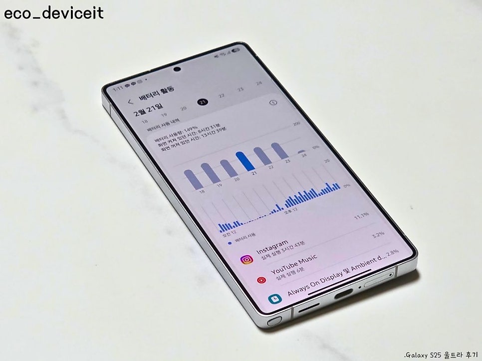 저는 여기서 전체화면 AOD를 활성화하여 사용하여 전반적으로 전작인 S24 울트라와 비슷하거나 40분 정도 오래 사용할 수 있었습니다.