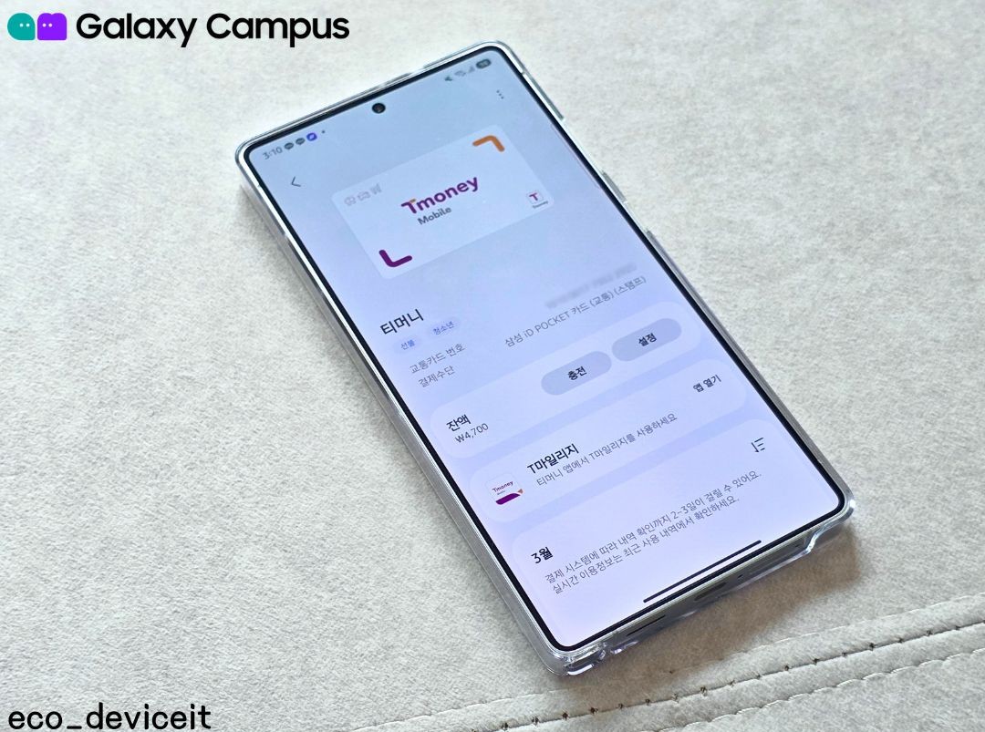 그리고 삼성월렛에 등록한 카드중에서 교통카드 기능을 지원하는 카드를 티머니에 연동하여 교통카드 용도로 사용하실 수 있으며, 휴대폰의 배터리가 없어도 후면만 갖다 대면 교통카드 결제가 되니 굉장히 편합니다!!
