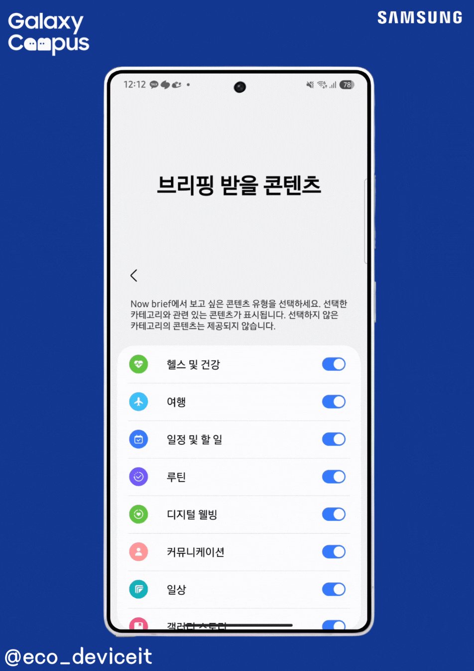 나우 브리프 기능은 아침, 점심 그리고 저녁을 기준으로 갤럭시 S25 울트라의 잠금화면에 나타나 날씨, 에너지 점수, 수면 점수, 환경, 일정 그리고 뉴스 정보 등으로 맞춤형 브리핑과 함께 격려의 메시지로 사용자에게 긍정적으로 제공합니다.