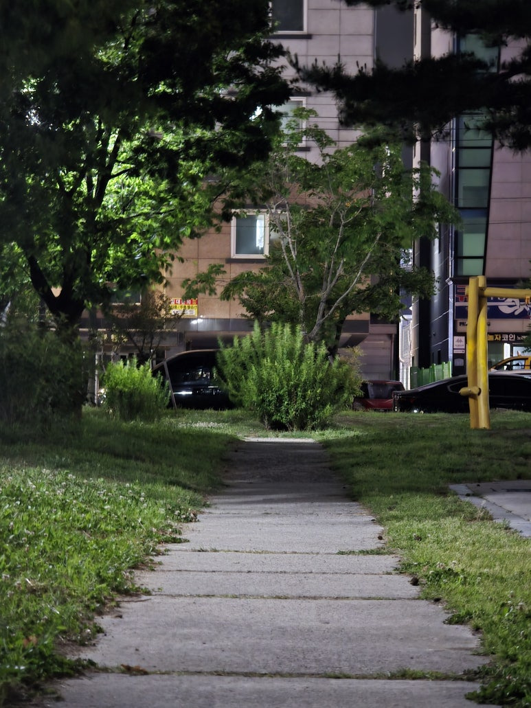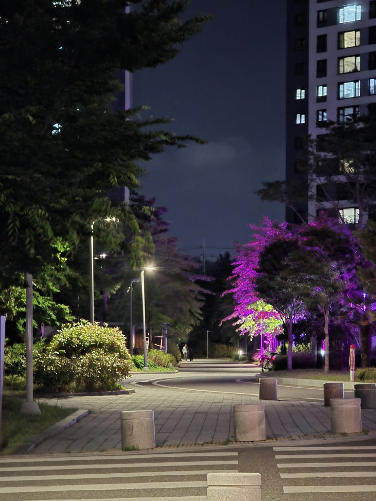 저는 주로 집 근처 공원에서 산책을 주로 하는데요!! 위 사진이 밤산책이라는 주제와 걸맞게 밤산책의 시작점입니다. 위 사진은 갤럭시 S25 울트라의 망원2를 활용한 5배줌 야간 사진입니다.