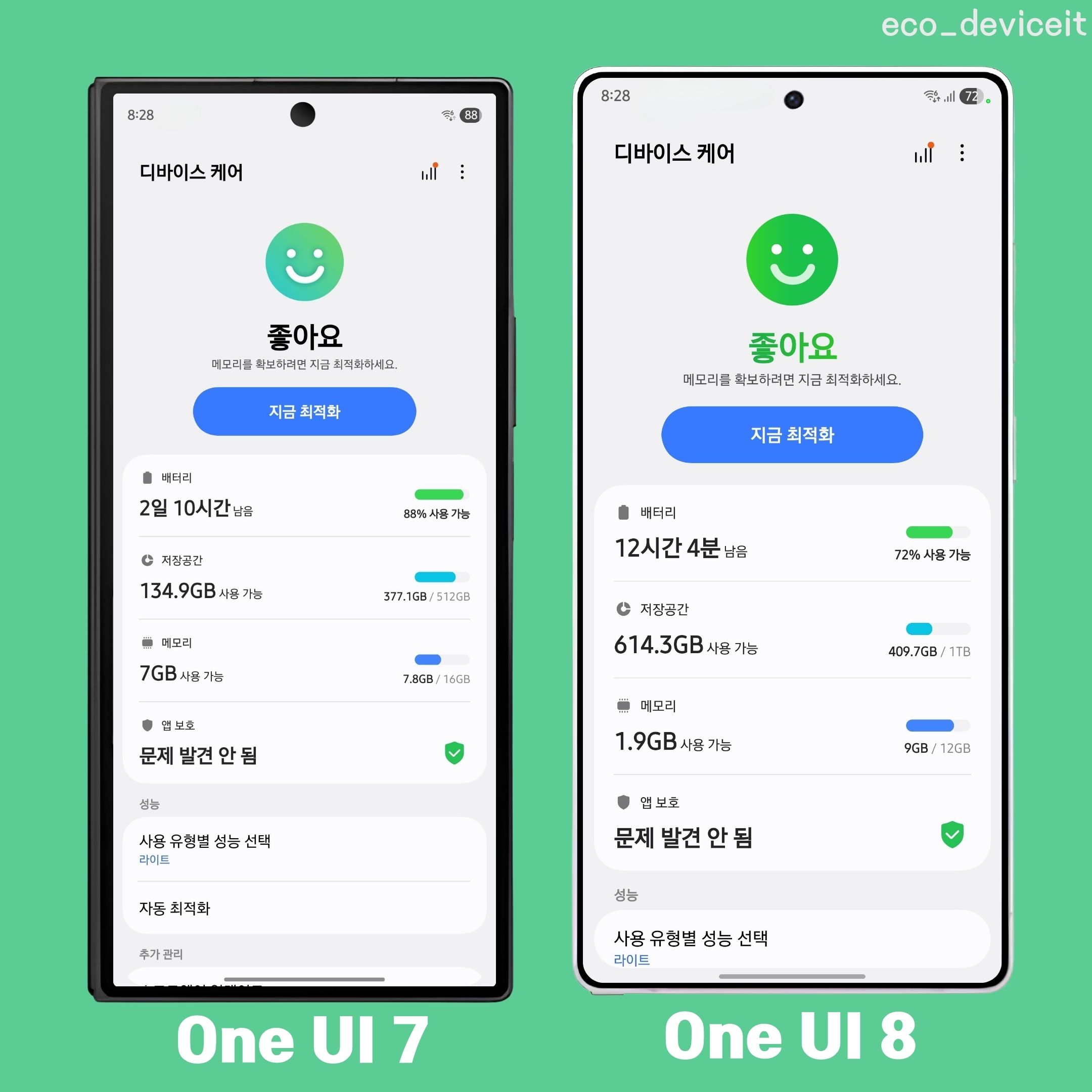 디바이스 케어에 램 플러스에서 One UI 7 까진 8GB까지 지원하였지만, One UI 8부턴 최대 12GB의 램 플러스로 저장공간을 활용할 수 있게 선택권이 넓어졌습니다.