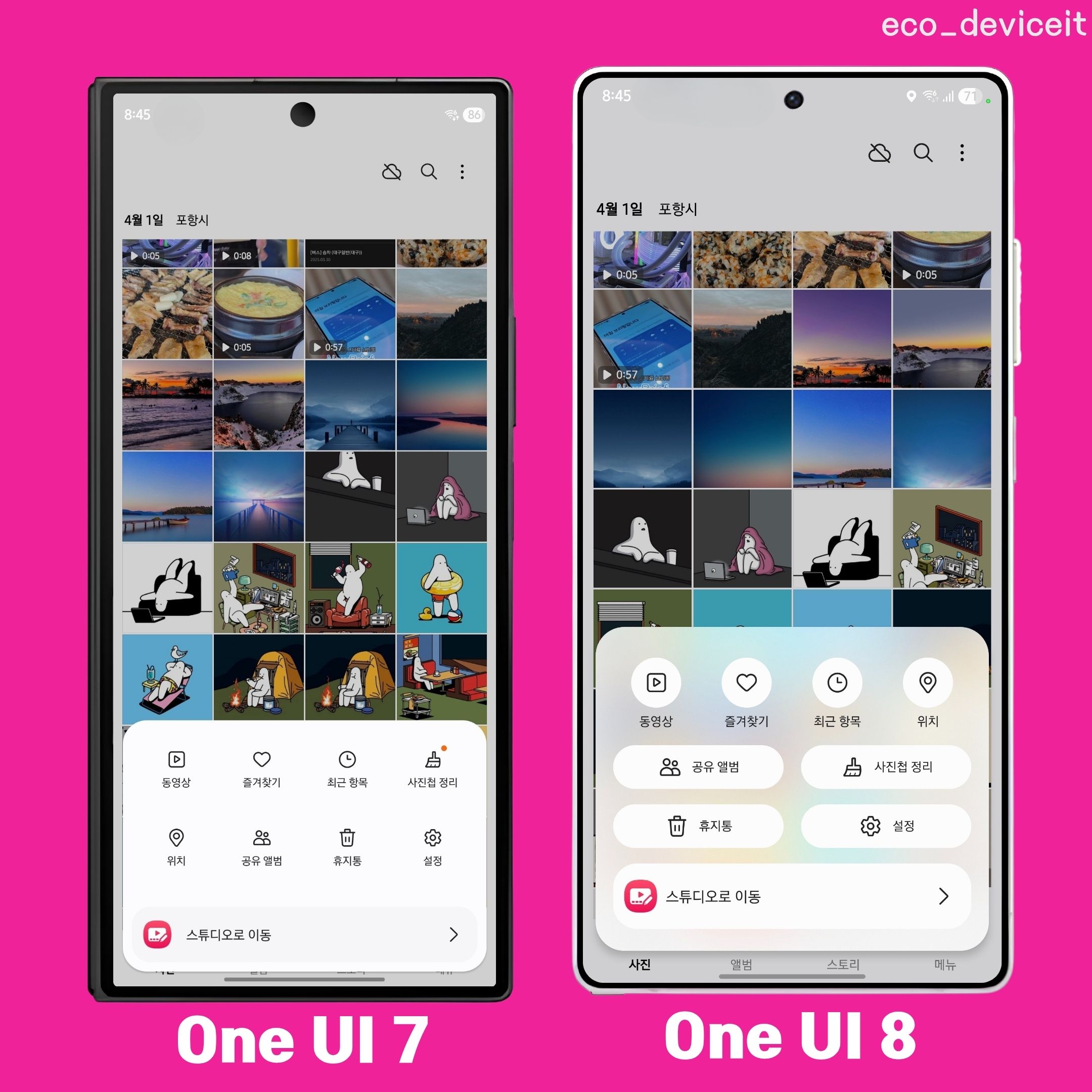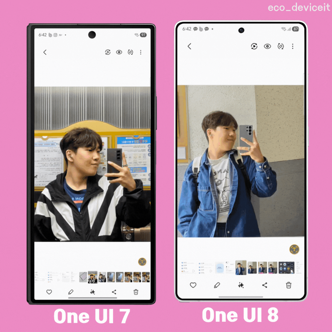 삼성 갤러리에서도 많은 변화가 이루어졌습니다. 삼성 갤러리에 있는 다양한 메뉴들이 하단에 위치해 있었지만, One UI 8 갤러리부터 플로팅 컨셉으로 메뉴들이 중앙에 떠 있는 컨셉으로 좀 더 정제된 느낌으로 디자인 되었네요!!