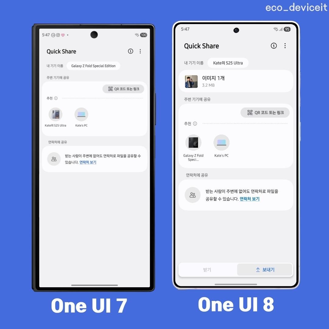 기존 One UI 7 까진 받기와 보내기 기능이 한 화면에 통합되어 있었고, One UI 8 부턴 받기와 보내기 탭을 나누어 좀 더 직관으로 파일을 쉽게 받고,공유할 수 있습니다.