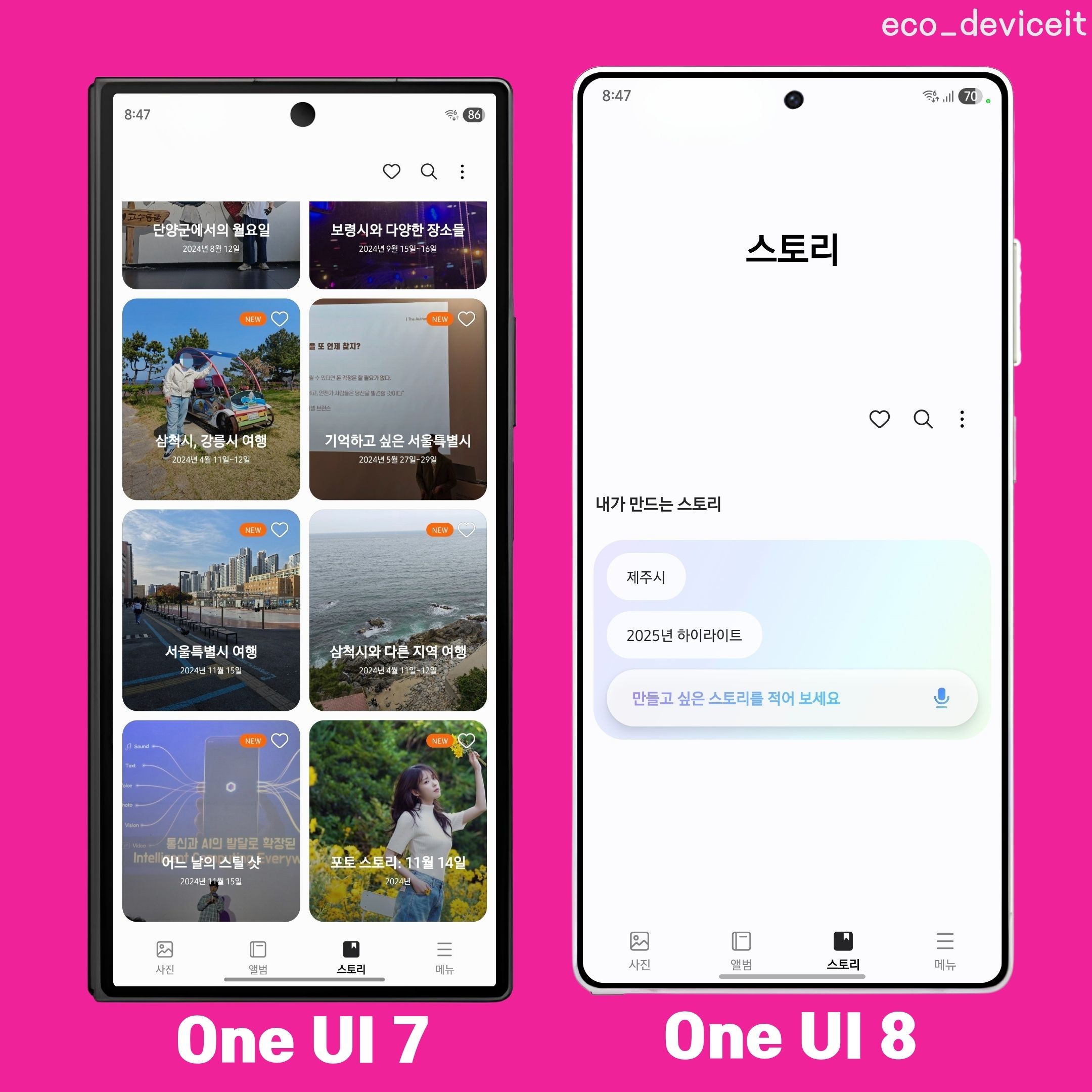 갤러리에서 스토리 기능은 기존까지 있었습니다. 이번 One UI 8 에서 스토리는 갤럭시 AI와 함께 스토리를 제작할 수 있습니다.